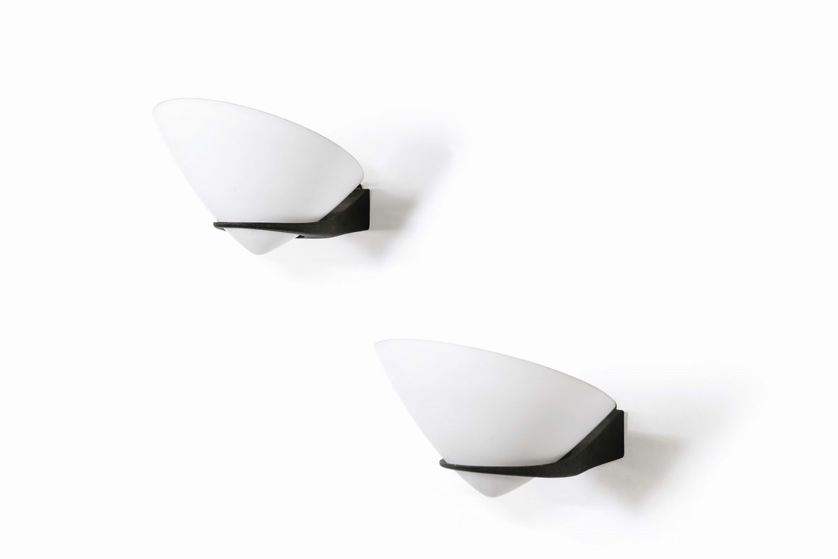 Coppia di lampade da parete in metallo verniciato e vetro opalino satinato
