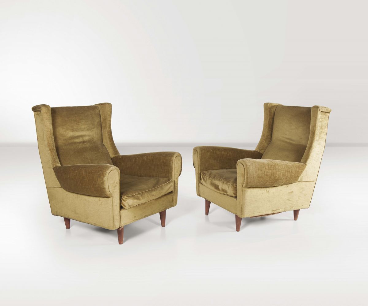 Coppia di poltrone in legno con rivestimenti in velluto.