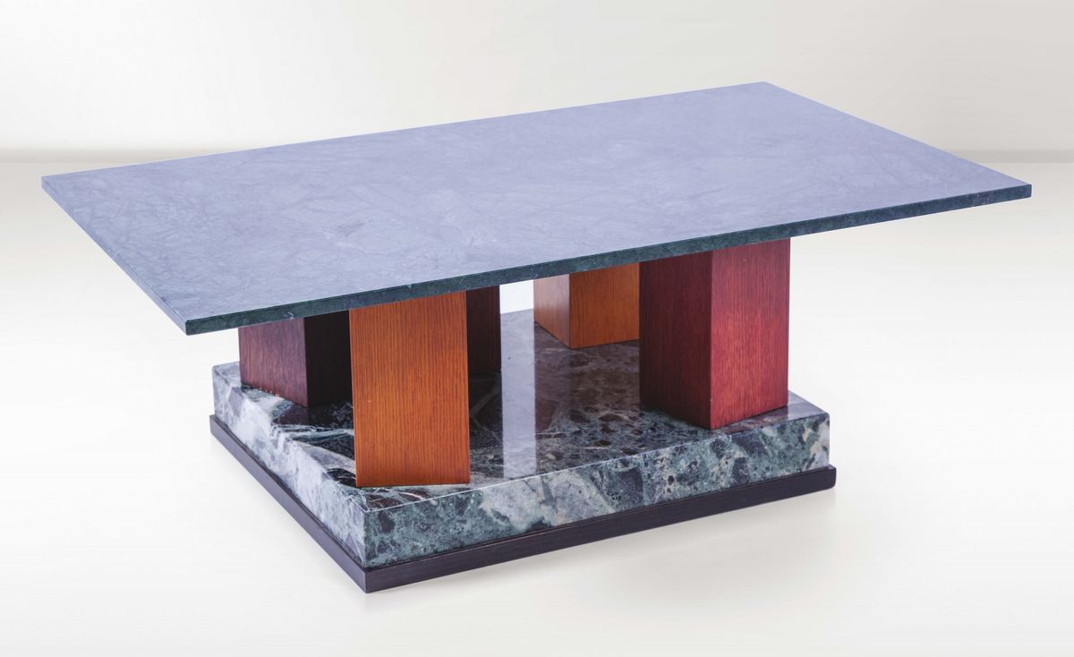 Raro tavolo basso in marmo e legno. Prod. Ultime Edizioni, Italia, 1988cm 120x43x70