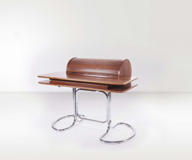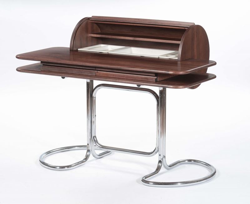 Scrittoio Maya con botte a serrandina in palissandro e struttura in acciaio.Prod. Bernini, Italia, 1969cm 118x92.5x75.5