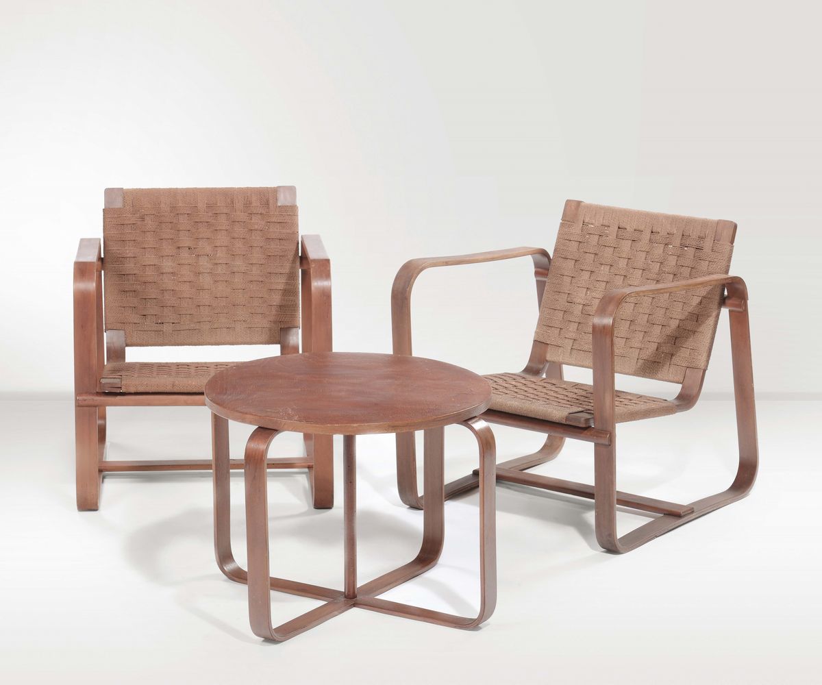 Salotto Lamellare composto da coppia di poltrone, divano, tavolino e coppia di sgabelli in rovere e acero con seduta e schienale in corda provenienti dall’Universitá Commerciale Luigi Bocconi.Prod. Maggioni, Italia, 1941cm 42x82x50