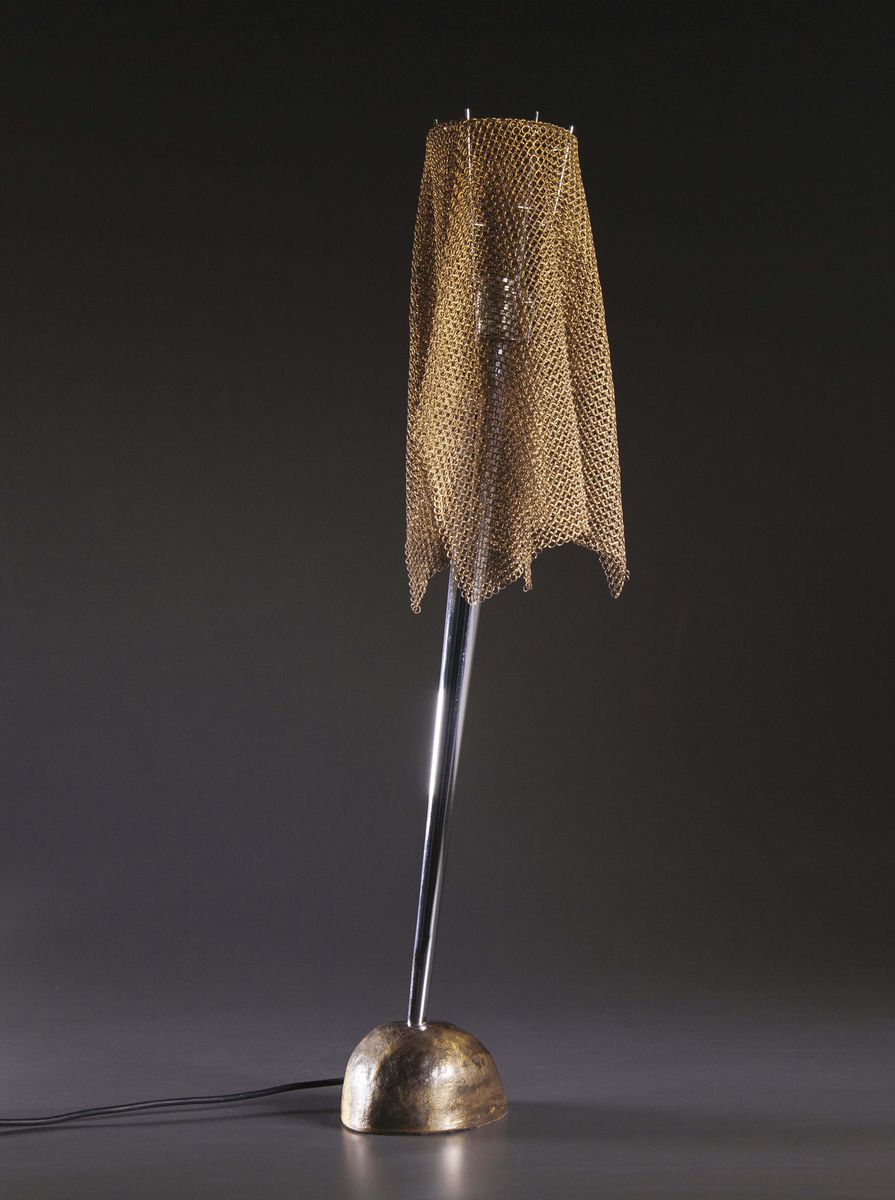 Lampada da tavolo Ecate in bronzo e metallo cromato con telo in maglia metallica.Prod. Artemide, Italia, 1990cm 13x84