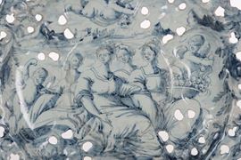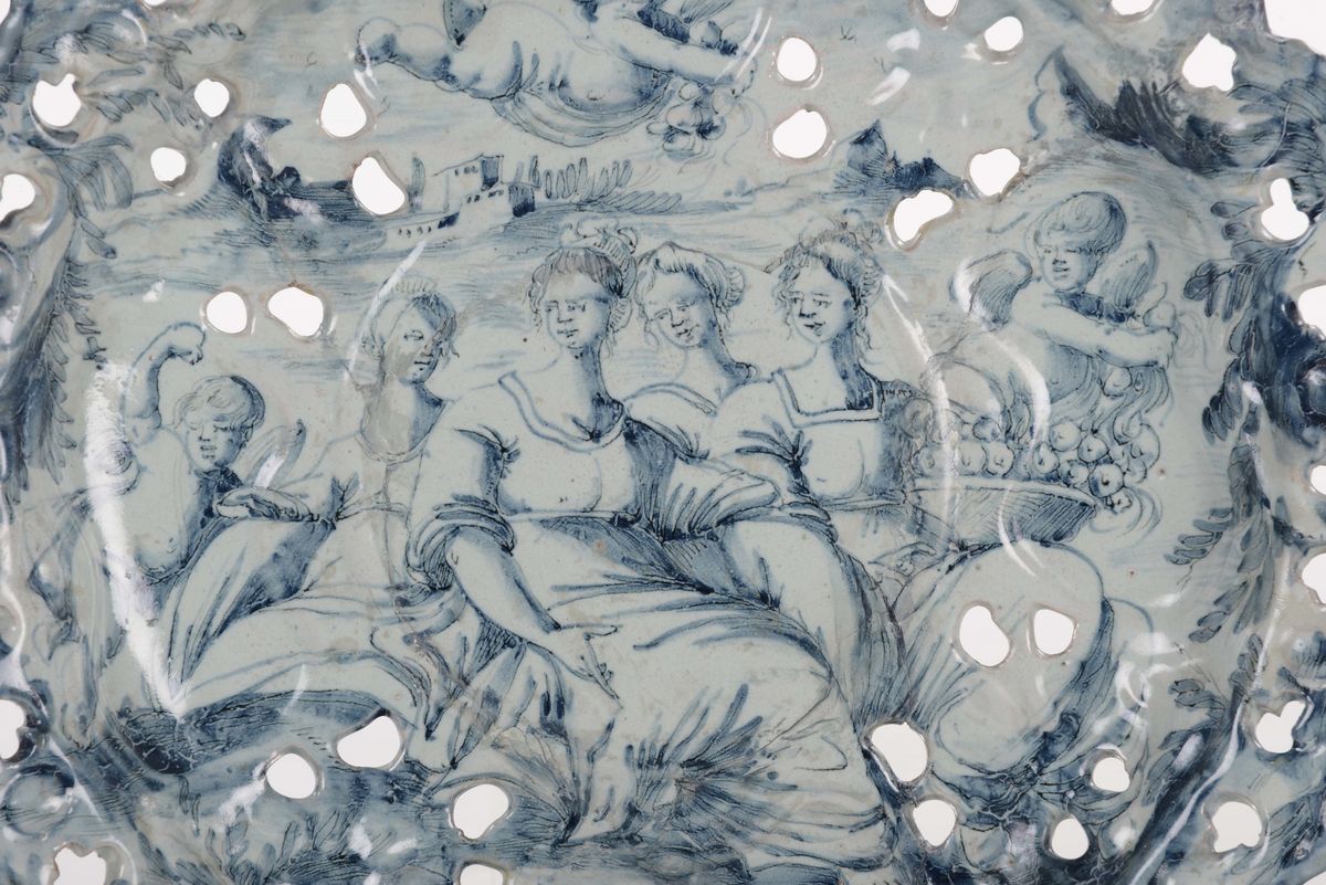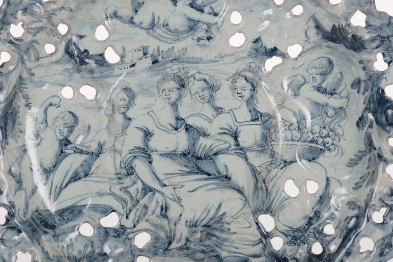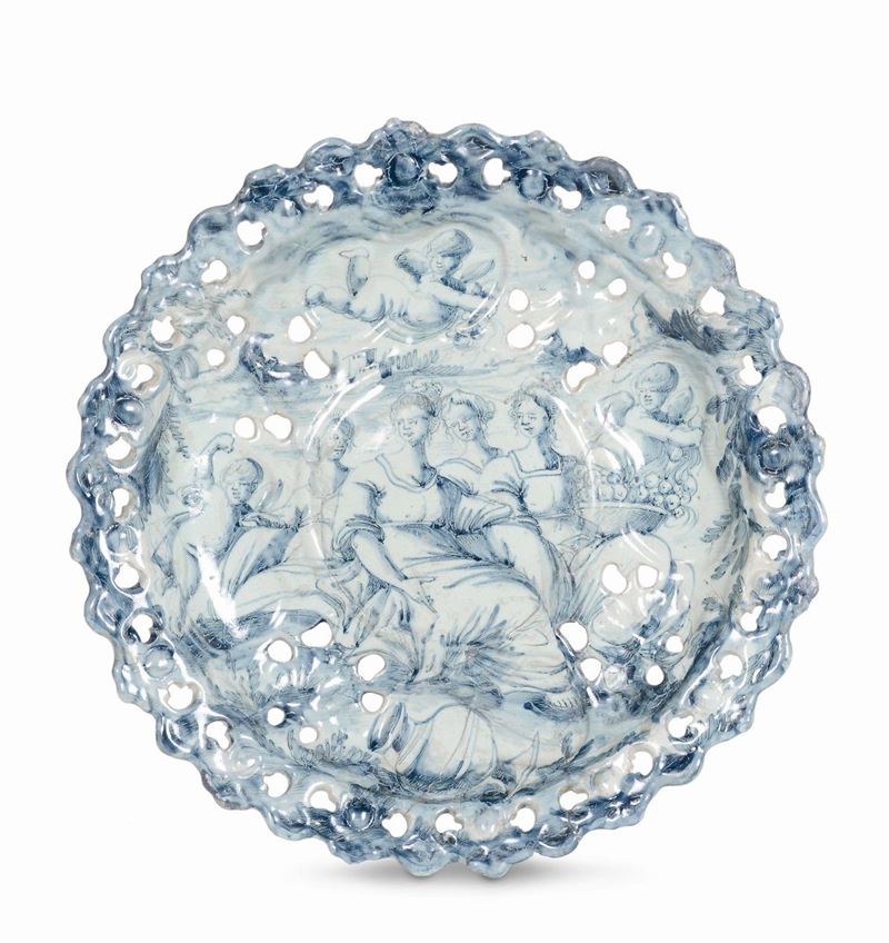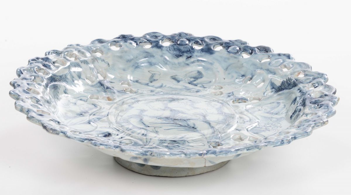 Alzata in maiolica decorata a scenografica barocca, Savona, marca Corona, XVIII secolo