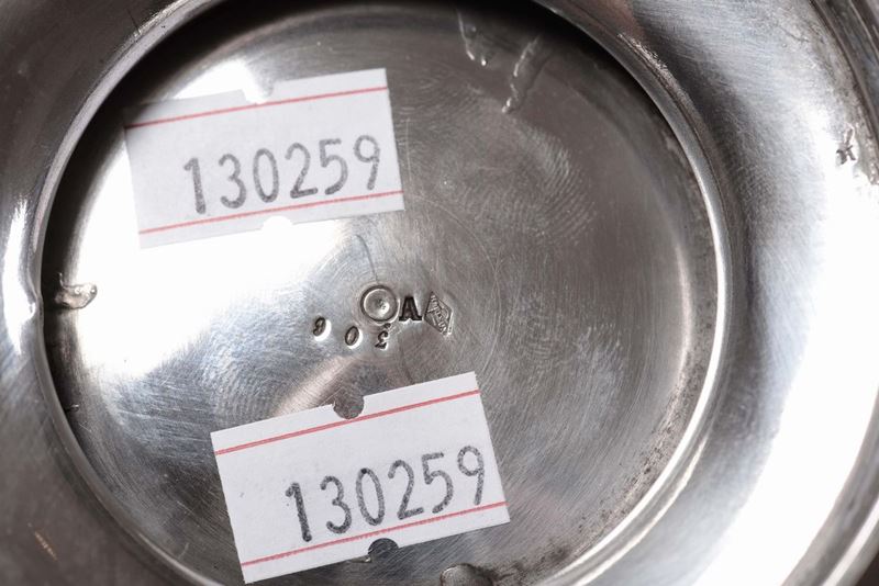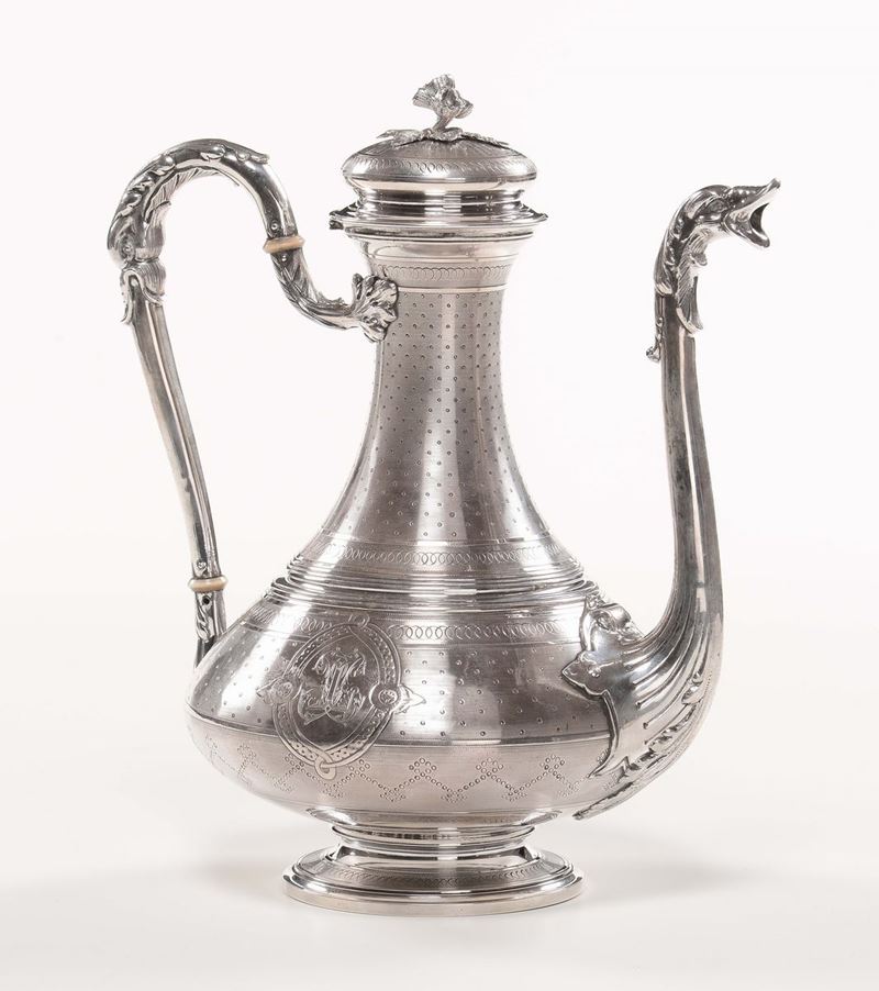 Caffettiera in argento fuso, sbalzato e cesellato, Francia, argentiere Harleux, inizio XX secolo