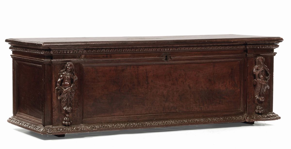 Cassapanca in noce intagliata, XVII secolo