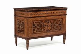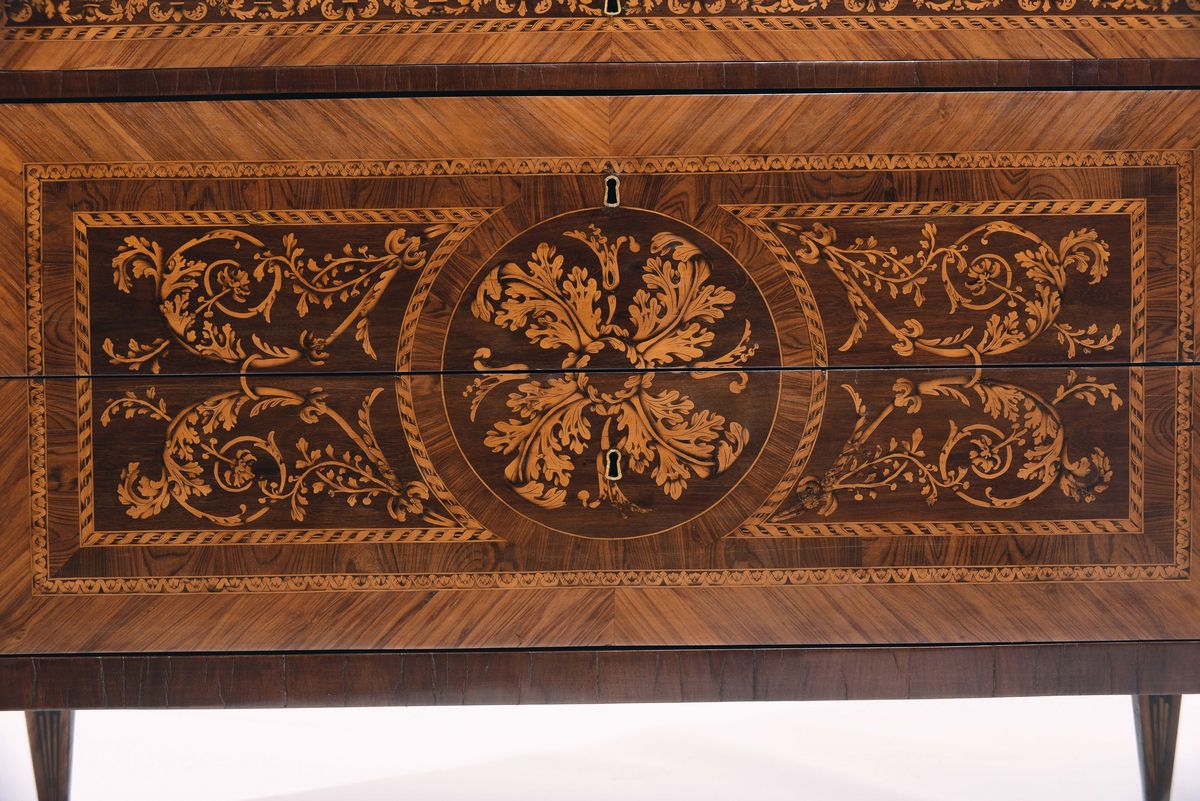 Cassettone Luigi XVI riccamente lastronato ed intarsiato in varie essenze nei modi del Maggiolini, Lombardia XVIII secolo [..]