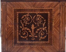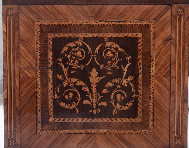 Cassettone Luigi XVI riccamente lastronato ed intarsiato in varie essenze nei modi del Maggiolini, Lombardia XVIII secolo