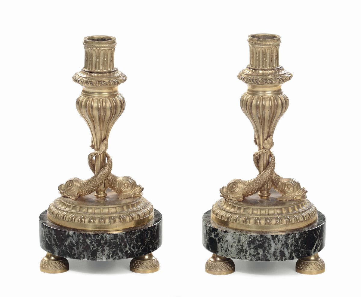 Coppia di candelieri in bronzo dorato con tritoni, XIX secolo