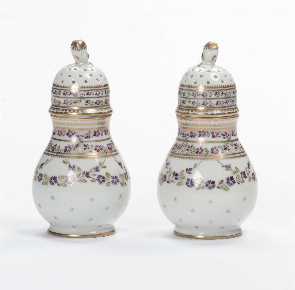 Coppia di spargizucchero in porcellana policroma, XX secolo