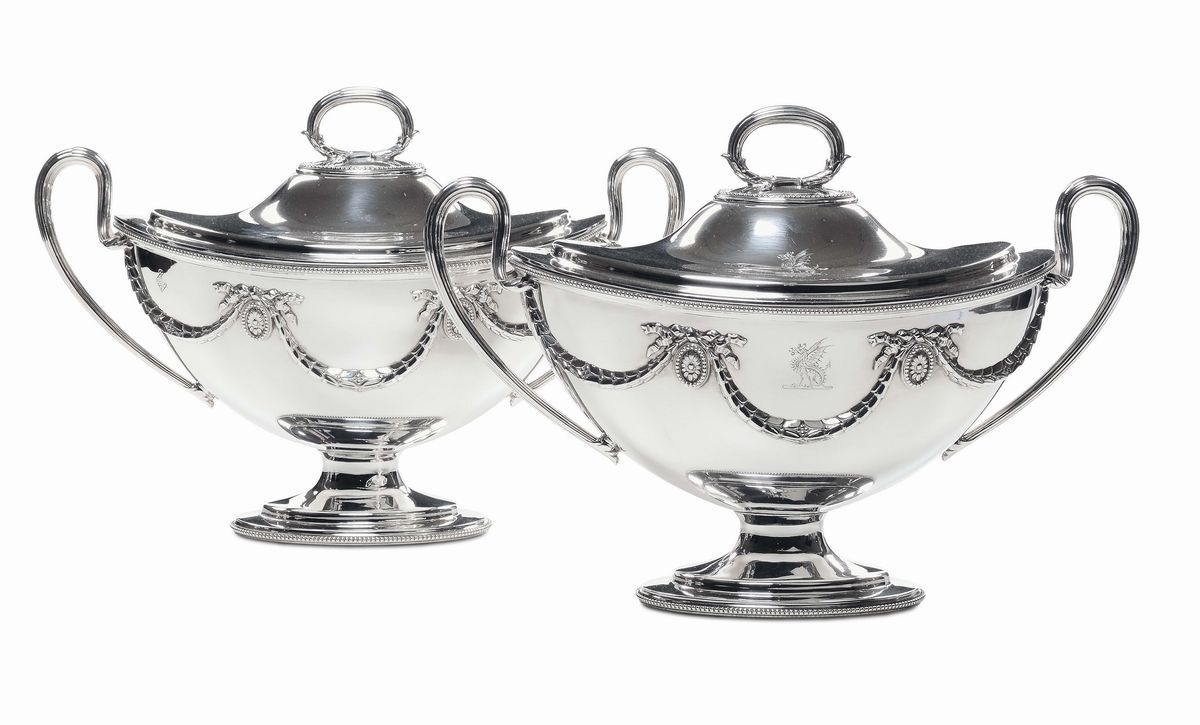 Coppia di zuppiere biansate in metallo argentato