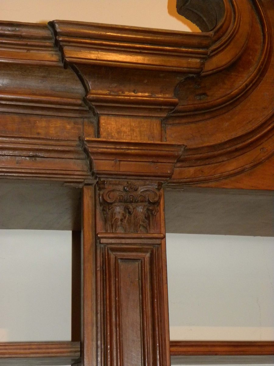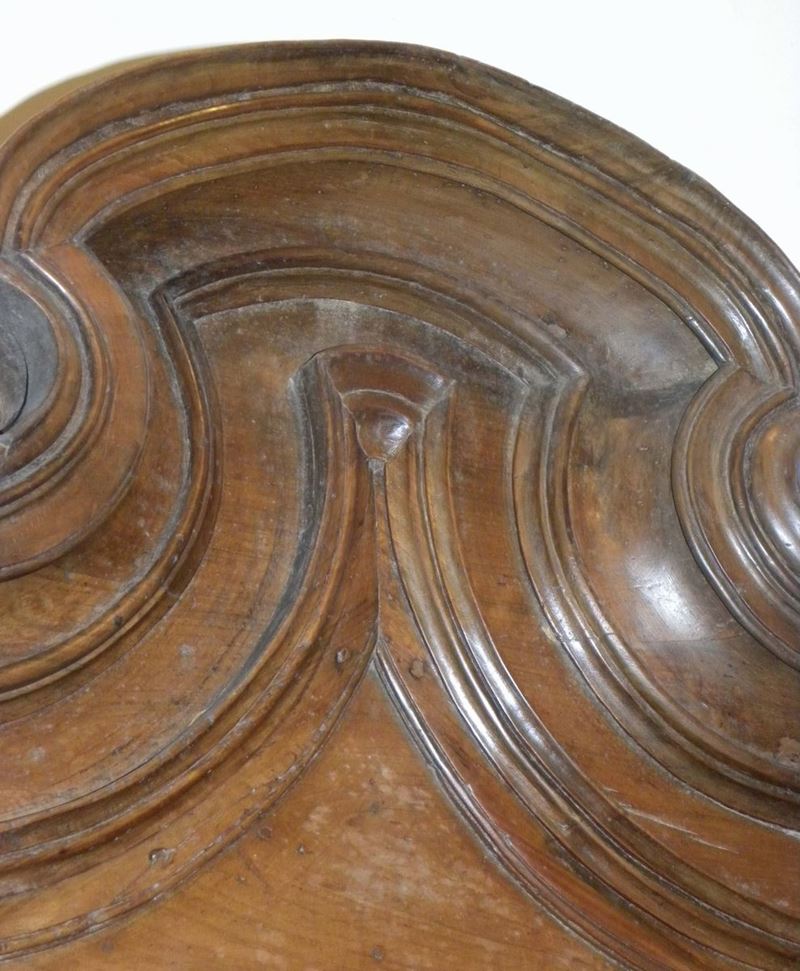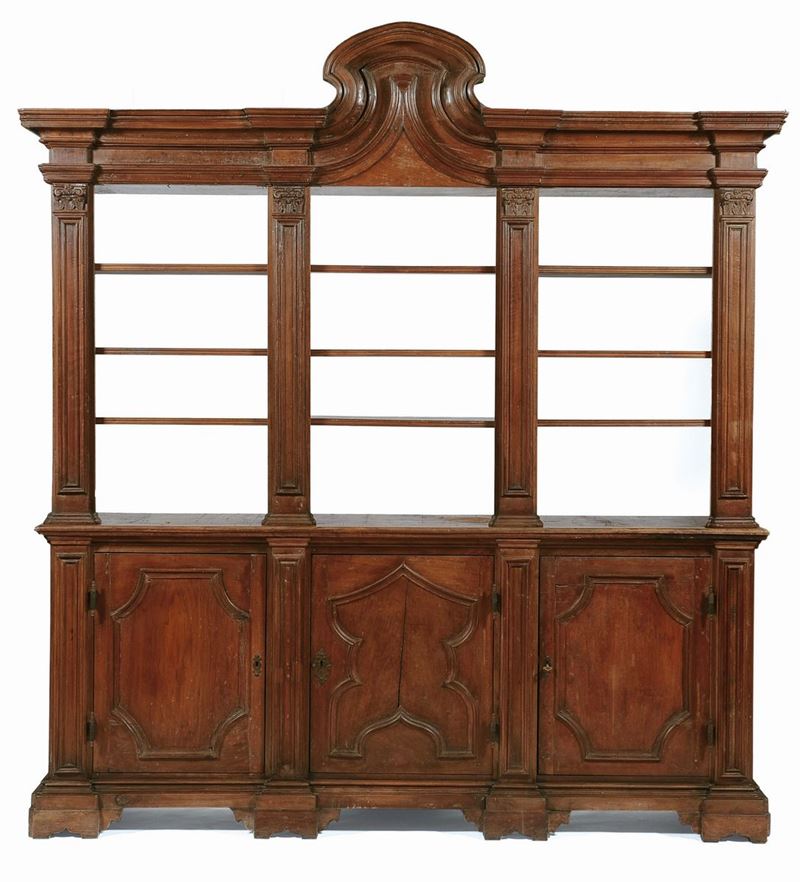 base a tre ante pannellate e alzata a giorno, montanti con lesene scolpite, cimasa centrale sagomata