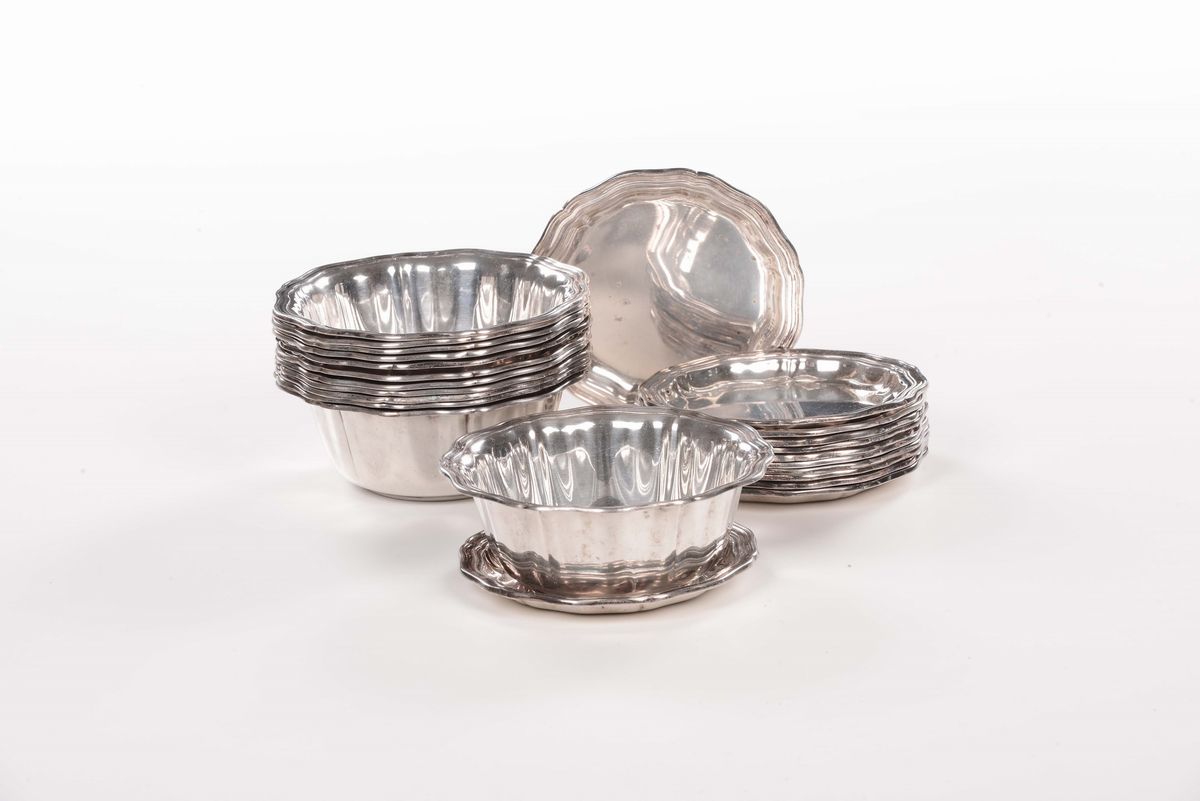Dodici ciotole e dodici piattini in argento