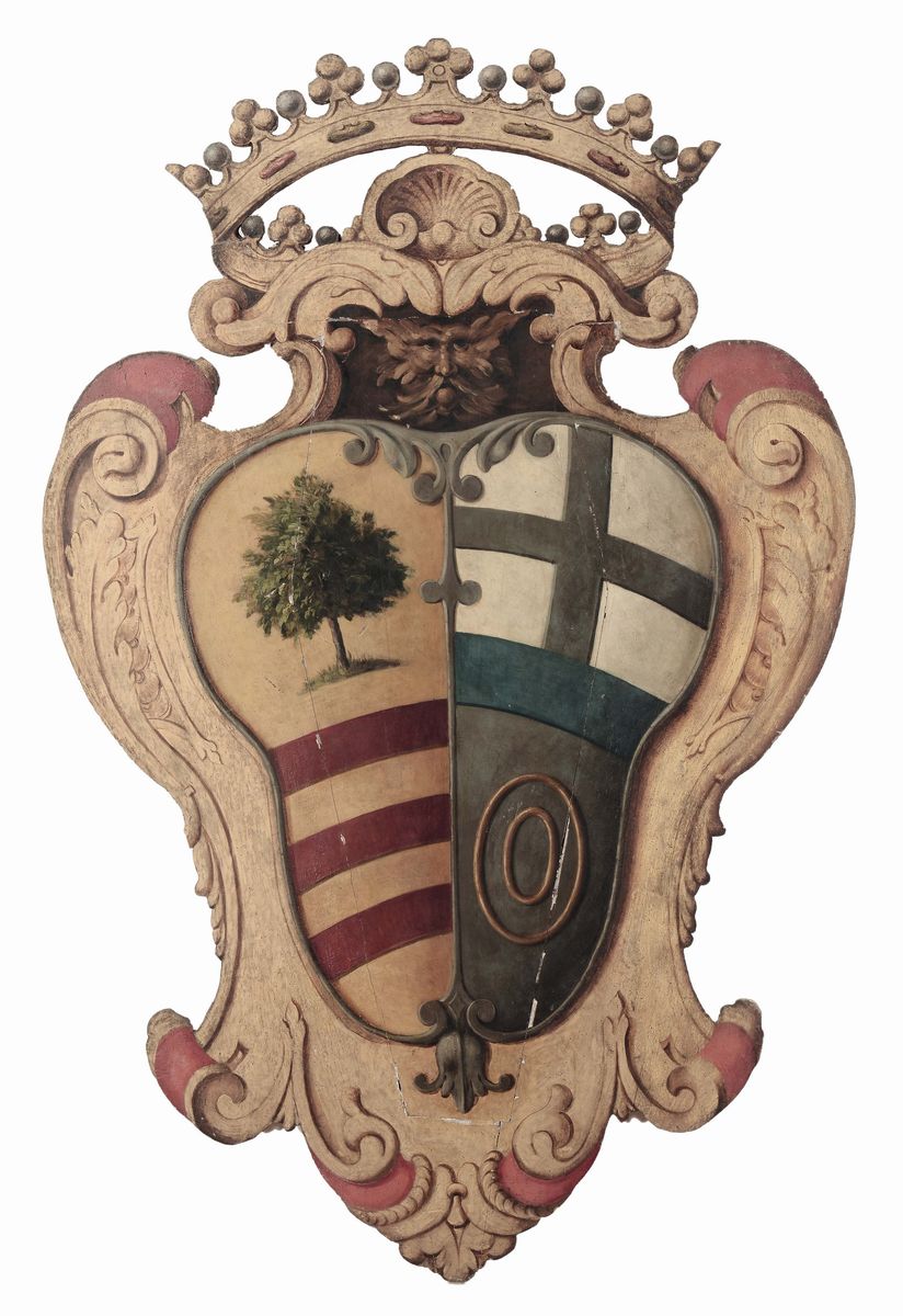 Grande stemma nobiliare su tavola dipinto e dorato, XVIII secolo