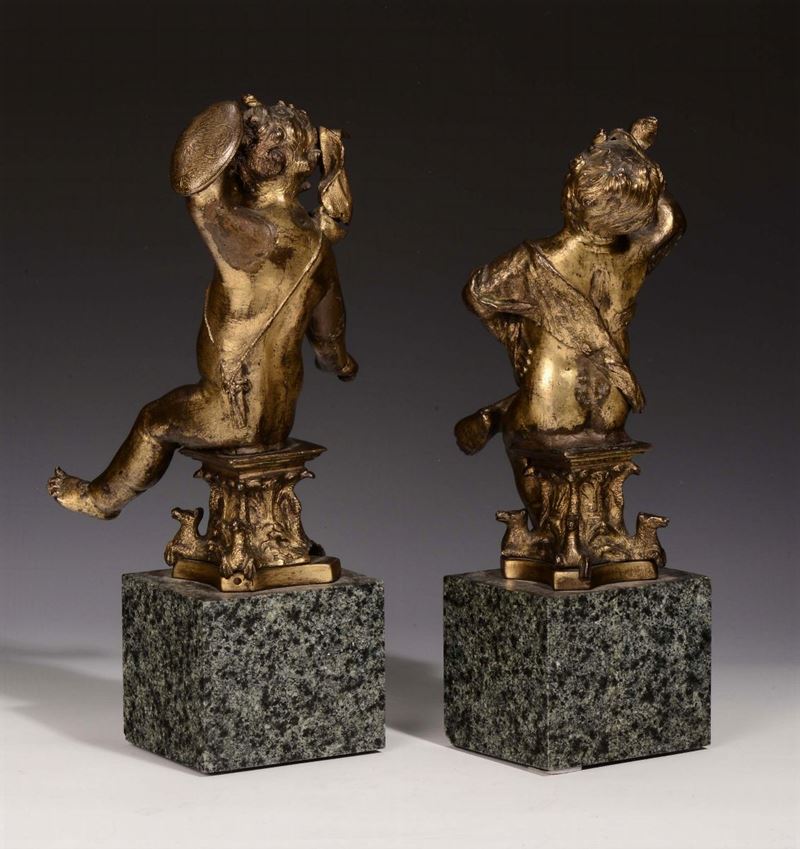Sculture barocche in bronzo dorato a fuoco raffiguranti due putti uno nell’atto di difendersi con un piccolo scudo ed il secondo mentre suona un corno. Basamento quadrato in granito non coevo - l'opera è provvista di attestato di libera circolazione