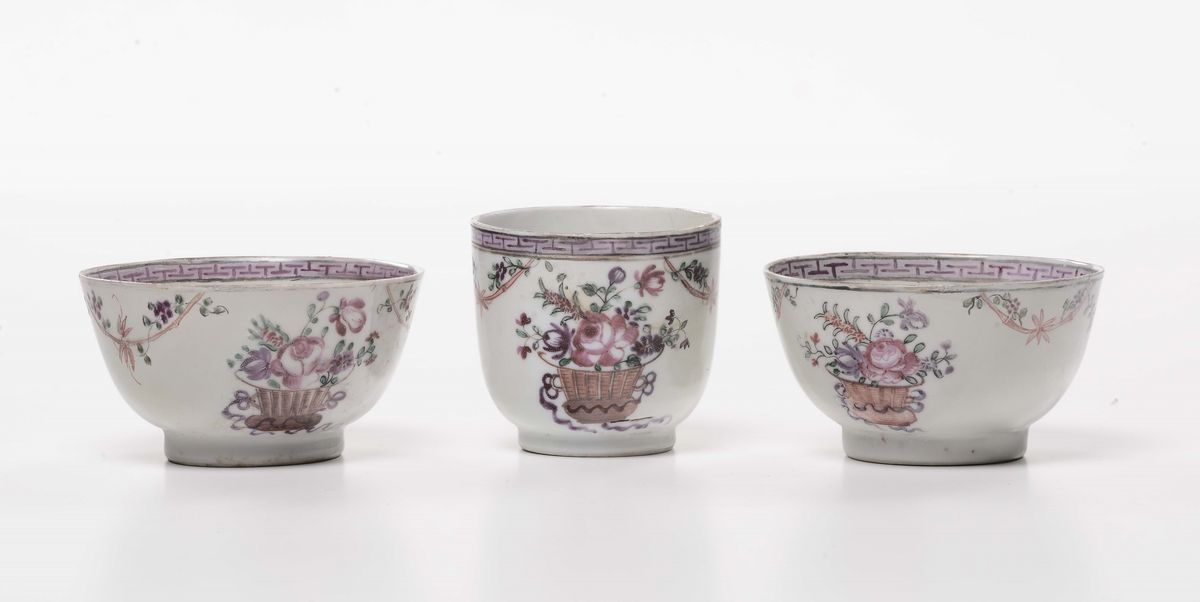 Lotto di tre tazzine in porcellana scompagnate a decoro floreale, Compagnia delle India