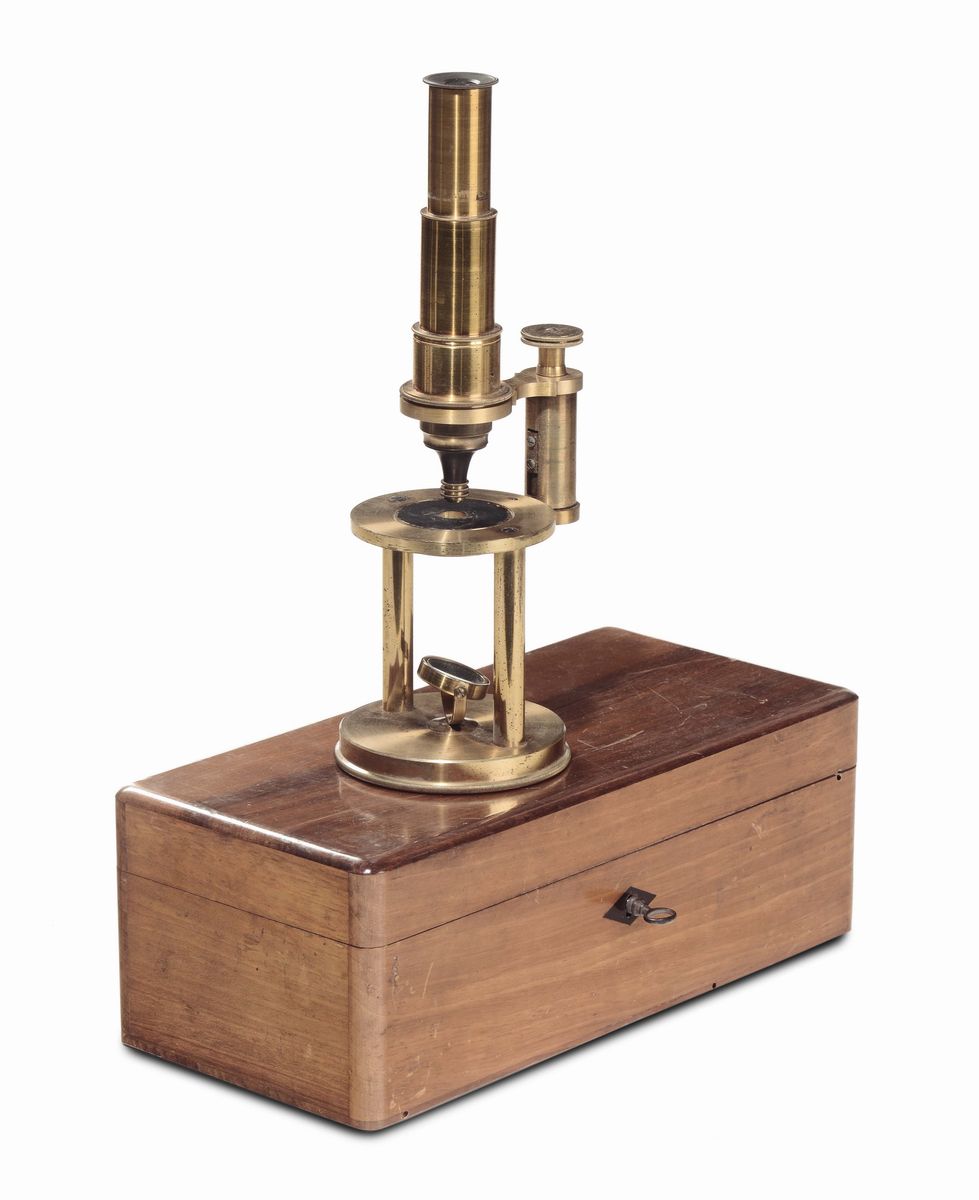 Microscopio in bronzo dorato con cassettina in legno coeva. Italia 1920/30