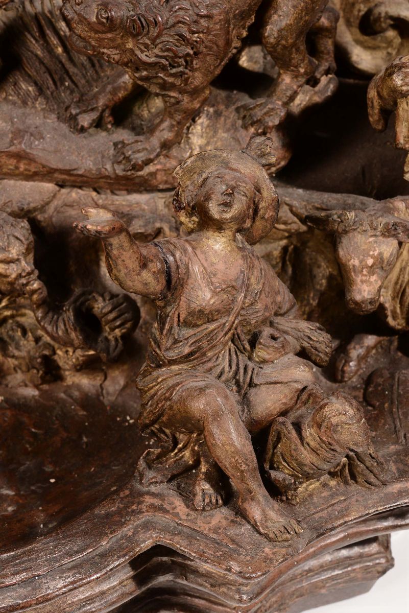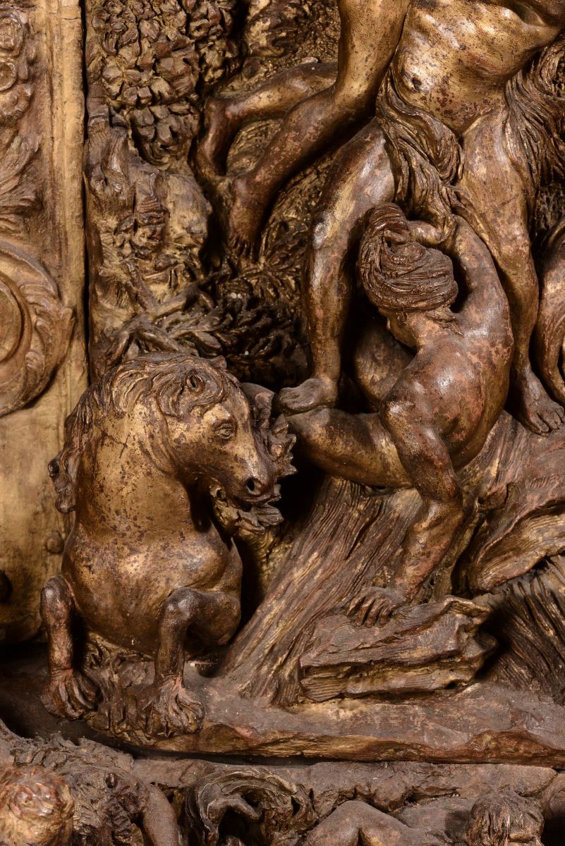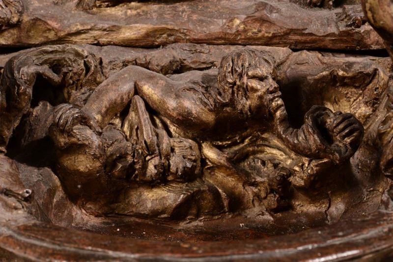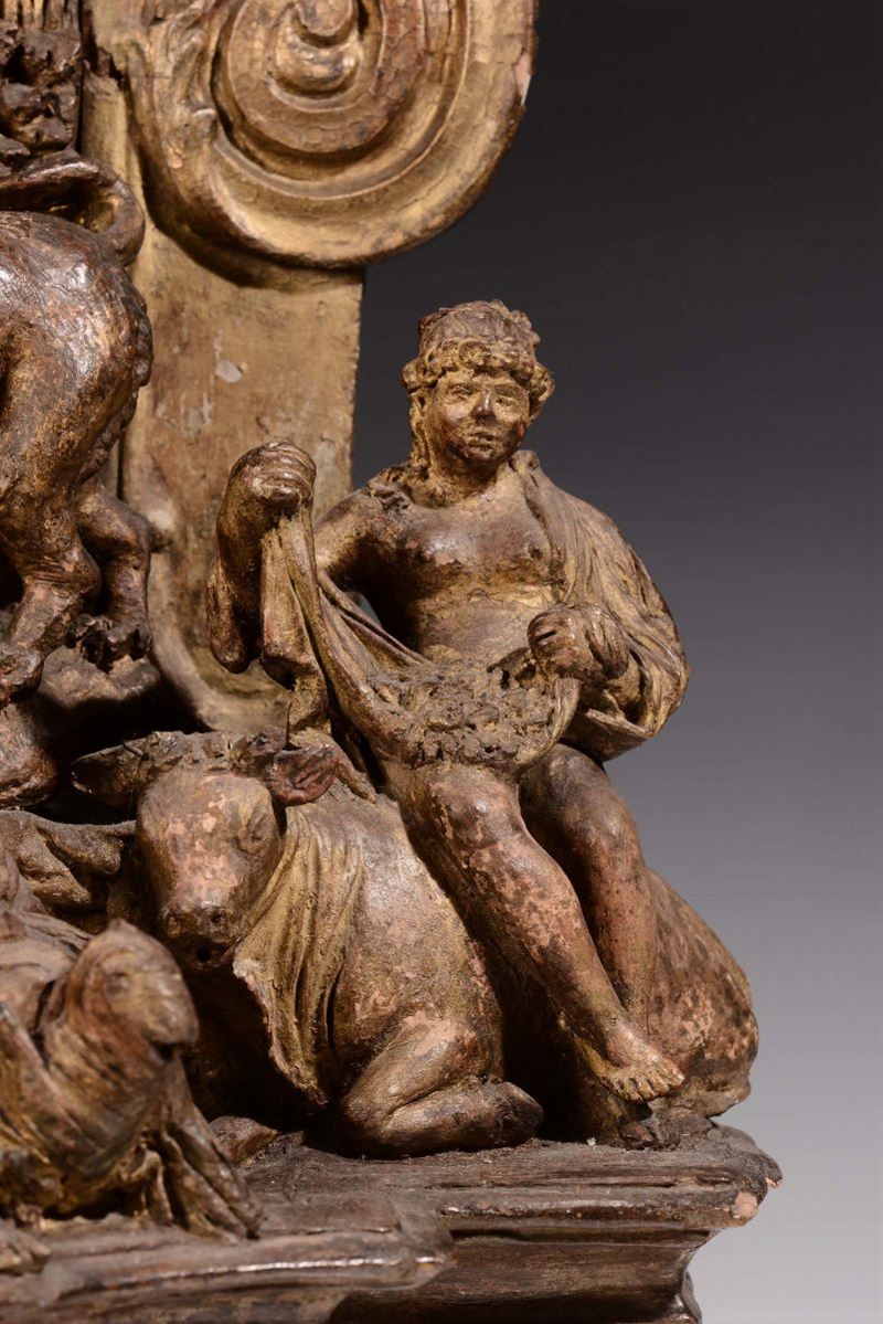 Grande gruppo in terracotta dorata rappresentante modello architettonico di fontana monumentale barocca. Sullo sfondo architettura con lesene a volute e mascheroni con ghirlande sormontata da stemma coronato dei nobili francesi d’Agricourt. Nella parte centrale scena mitologica con raffigurazione della lotta tra Ercole ed Anteo, con Busiride a terra, attorniato da figure animali, disposte a semicerchio sulla base mistilinea figure allegoriche delle stagioni. Dell’opera esiste una acquaforte, raffigurante il particolare centrale della lotta tra Ercole ed Anteo, recante la firma di Francois Boucher, Pierre Alexandre Avelin e Gabriel Huquier, che permette di stabilire in Aveline l’autore della “...traduzione plastica del progetto grafico di Boucher, messa in opera presumibilmente nella terza decade del XVIII secolo”, come scrive nella scheda critica che accompagna l’opera la dottoressa Guendalina Serafinelli