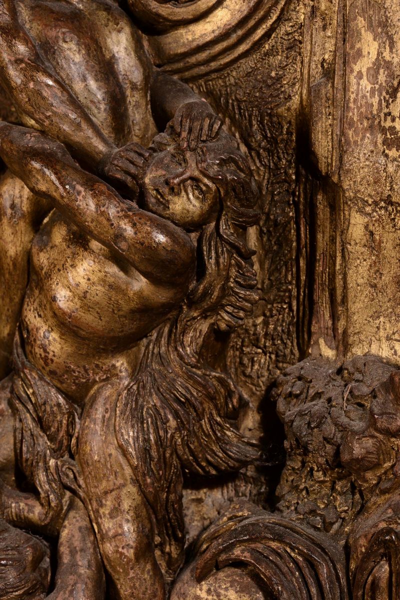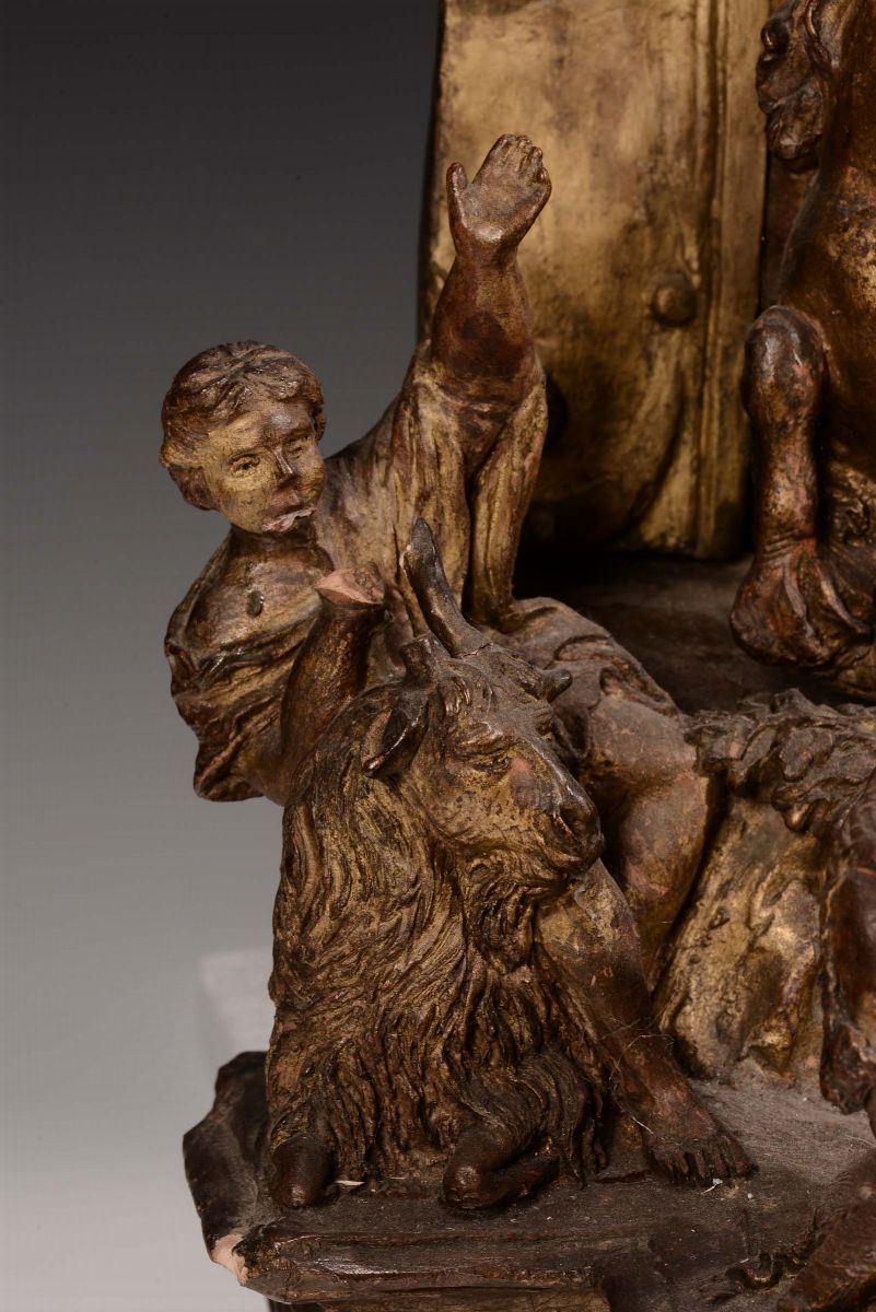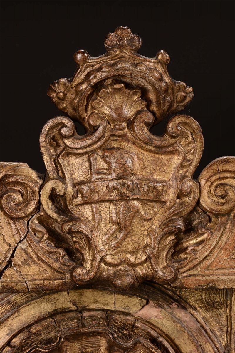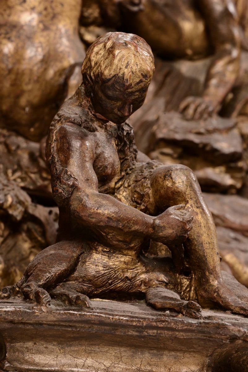 Grande gruppo in terracotta dorata rappresentante modello architettonico di fontana monumentale barocca. Sullo sfondo architettura con lesene a volute e mascheroni con ghirlande sormontata da stemma coronato dei nobili francesi d’Agricourt. Nella parte centrale scena mitologica con raffigurazione della lotta tra Ercole ed Anteo, con Busiride a terra, attorniato da figure animali, disposte a semicerchio sulla base mistilinea figure allegoriche delle stagioni. Dell’opera esiste una acquaforte, raffigurante il particolare centrale della lotta tra Ercole ed Anteo, recante la firma di Francois Boucher, Pierre Alexandre Avelin e Gabriel Huquier, che permette di stabilire in Aveline l’autore della “...traduzione plastica del progetto grafico di Boucher, messa in opera presumibilmente nella terza decade del XVIII secolo”, come scrive nella scheda critica che accompagna l’opera la dottoressa Guendalina Serafinelli