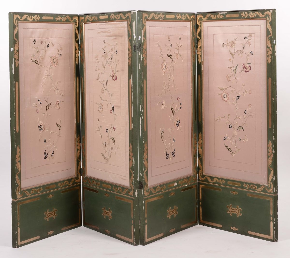 Paravento a quattro ante laccato verde e dorato, XX secolo