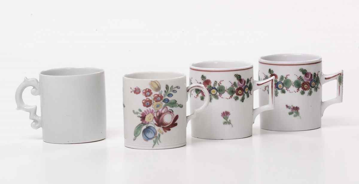 Quattro tazzine in porcellana di cui tre a decoro floreale ed una bianca