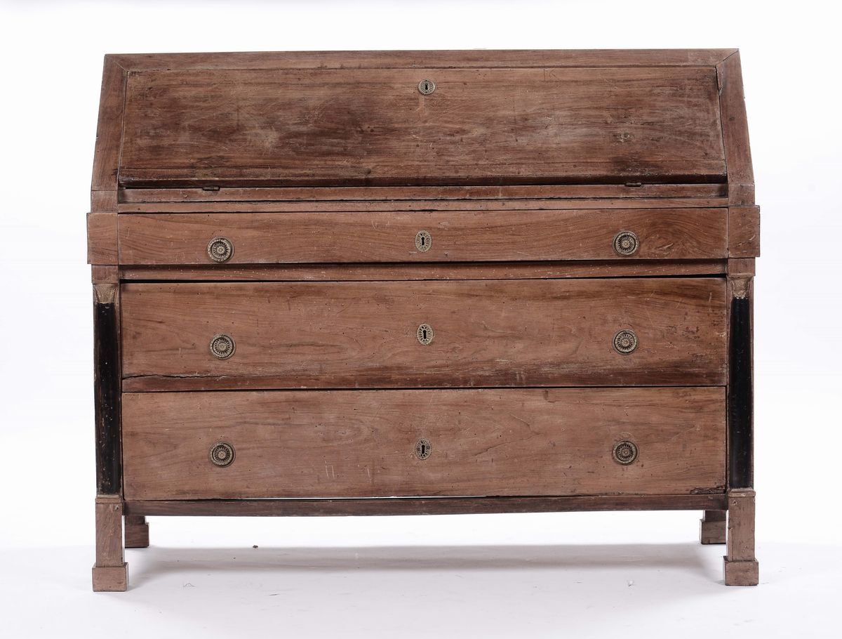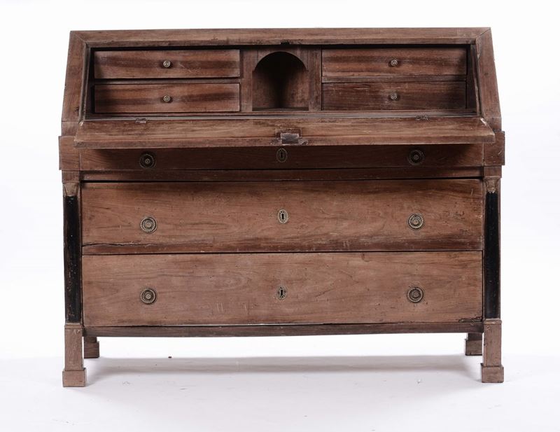 due cassetti sotto la calatoia che cela cassettini e vani a giorno, mezze colonne ebanizzate sui montanti, cm 132x57x106