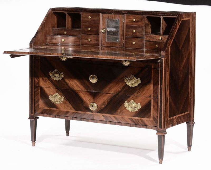 fronte e fianchi dritti, due cassetti a specchio sotto la calatoia celante scarabattolo, vani a giorno ed antina centrale a specchio, gambe troncopiramidali, cm 118x59x110