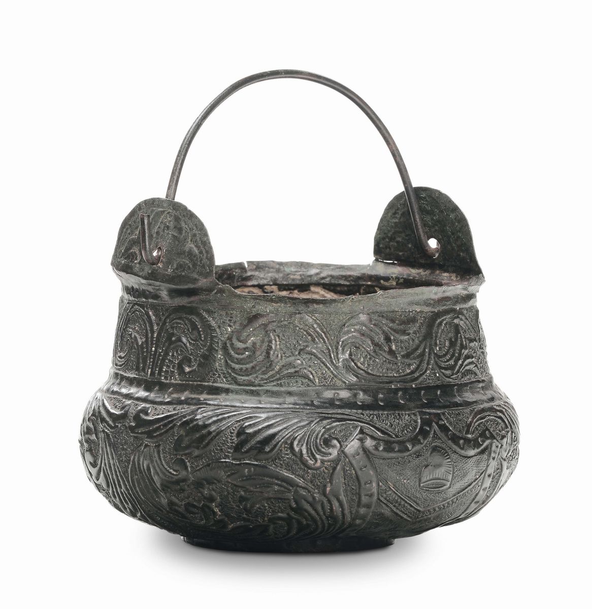 decori vegetali sbalzati e profilo maschile entro riserva, altezza cm 9,5, diametro cm 13