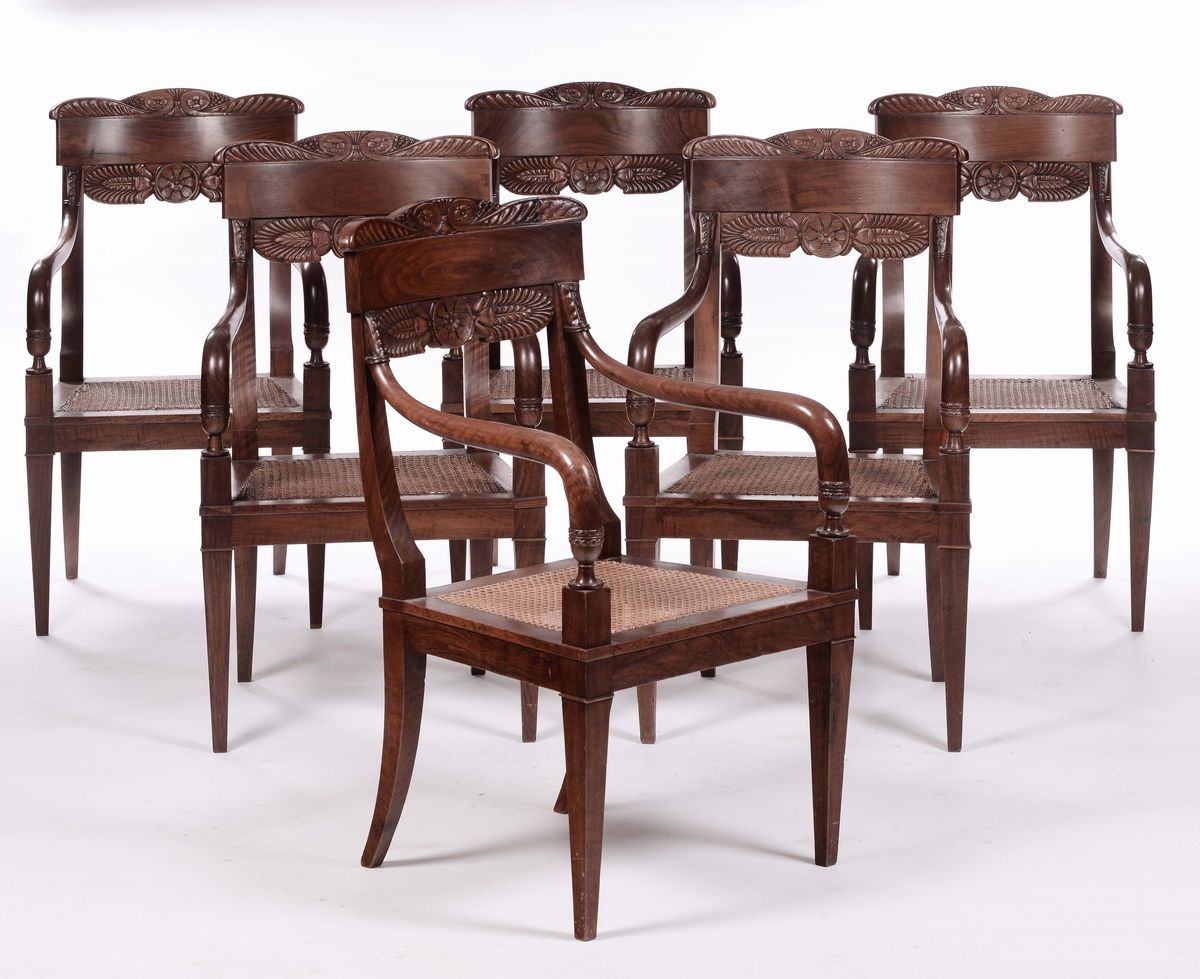 Sei sedie Carlo X in noce intagliato, XIX secolo