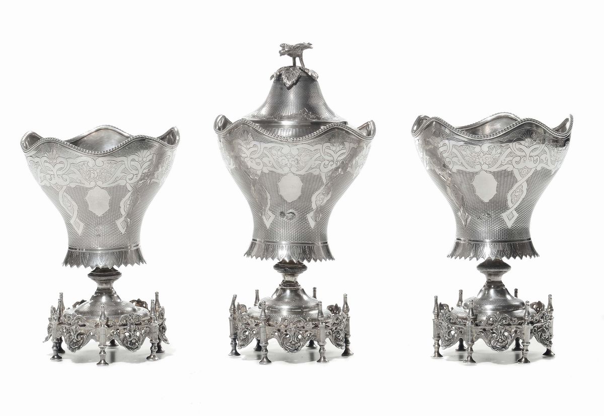 Set composto da tre compostiere in argento sbalzato ed inciso, punzoni ottomani, Turchia XIX secolo