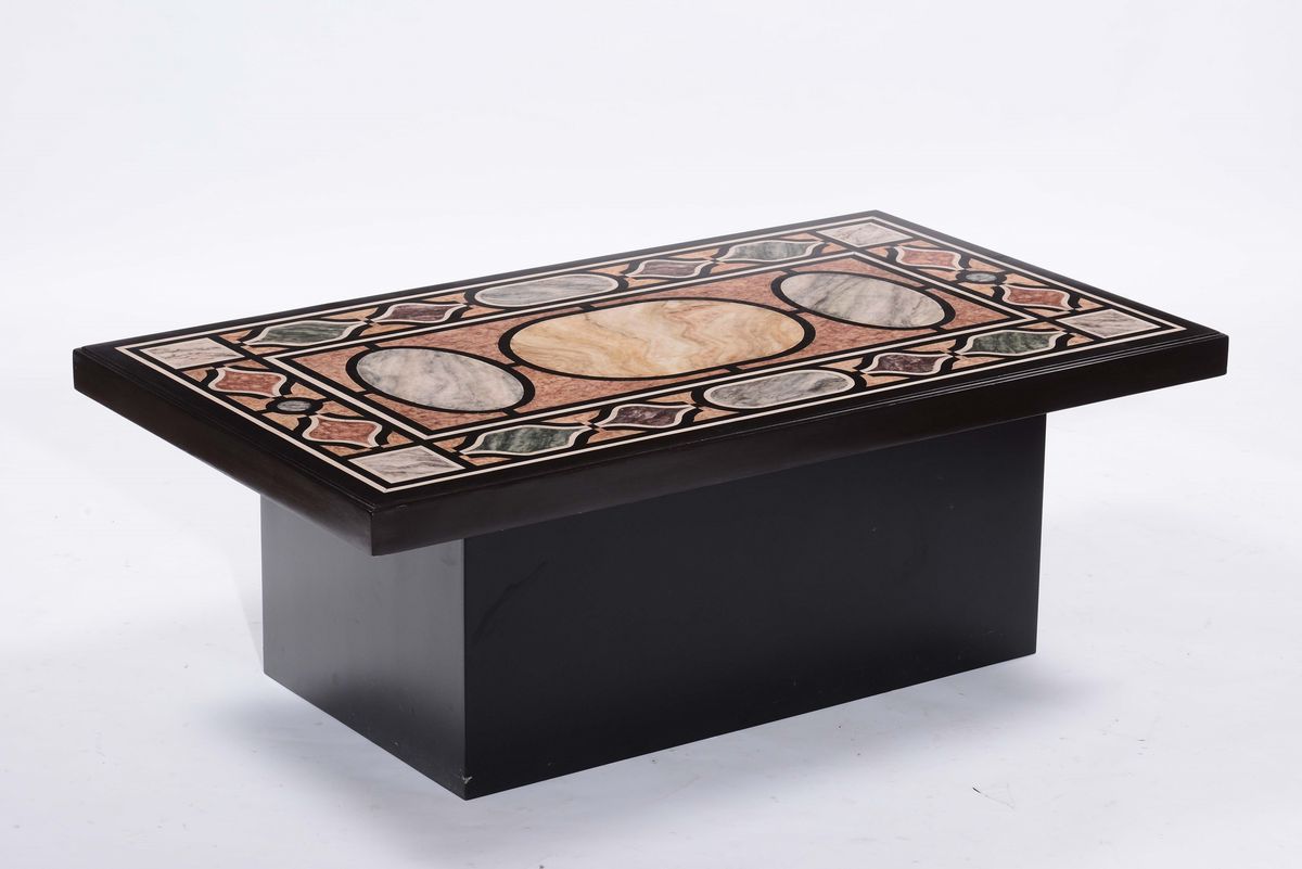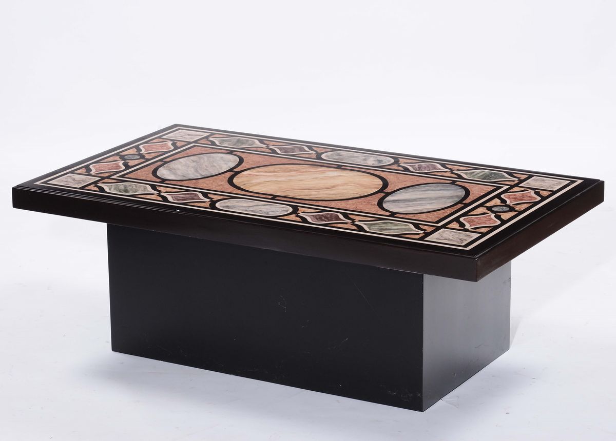 Tre tavoli con pannelli dipinti a finta scagliola, monogrammati, Venezia XIX secolo