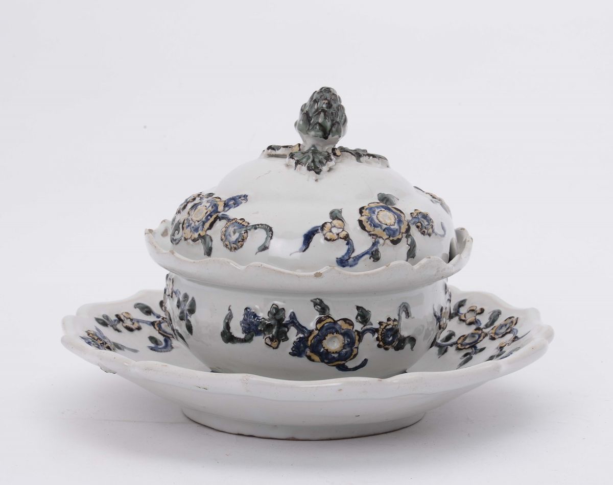 Zuppierina con coperchio e piatto in maiolica, Emilia XIX secolo