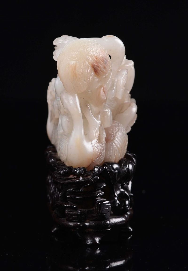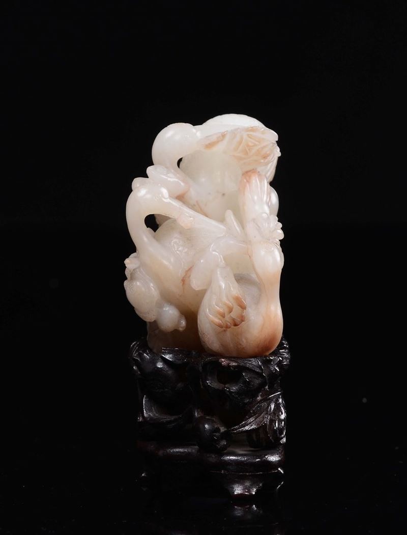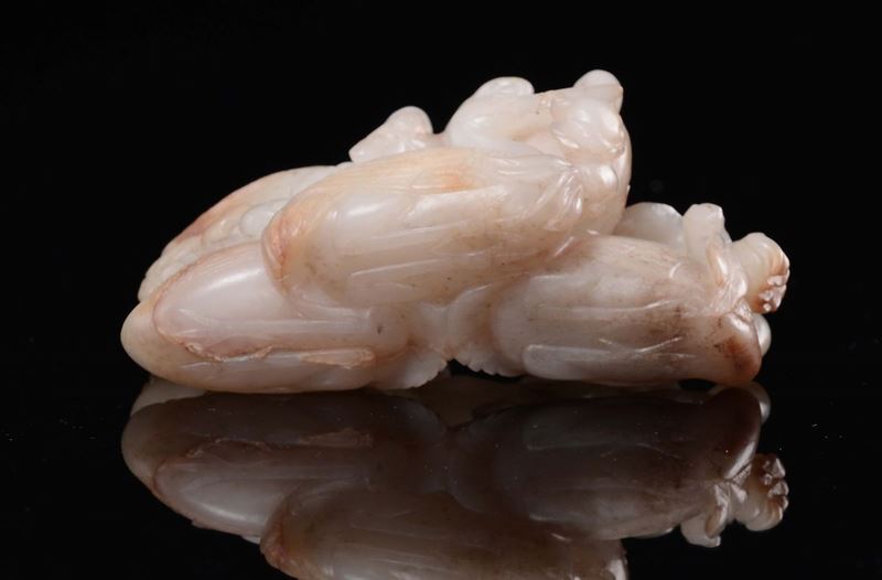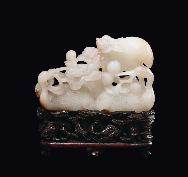Bel gruppo in giada bianca e russet con gru e frutti, Cina, Dinastia Qing, XVIII secolo