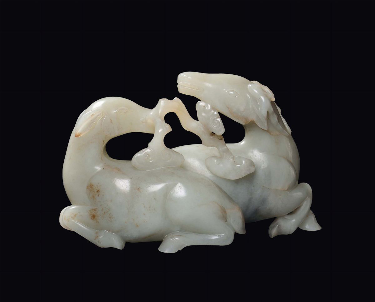 Bel gruppo raffigurante due cerbiatti in giada bianca, Cina, Dinastia Qing, periodo Qianlong (1736-1795)