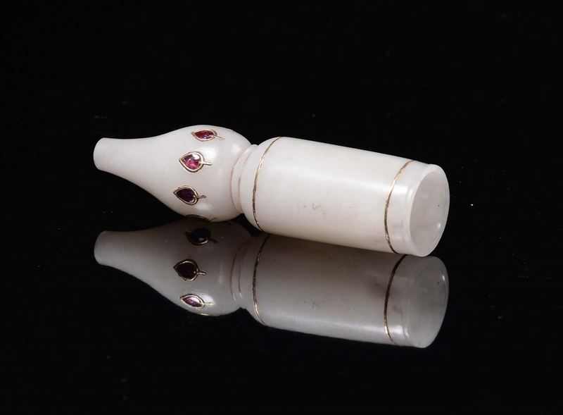 Bocchino in giada bianca Mogul con profili dorati e rubini, Cina, Dinastia Qing, XVIII secolo