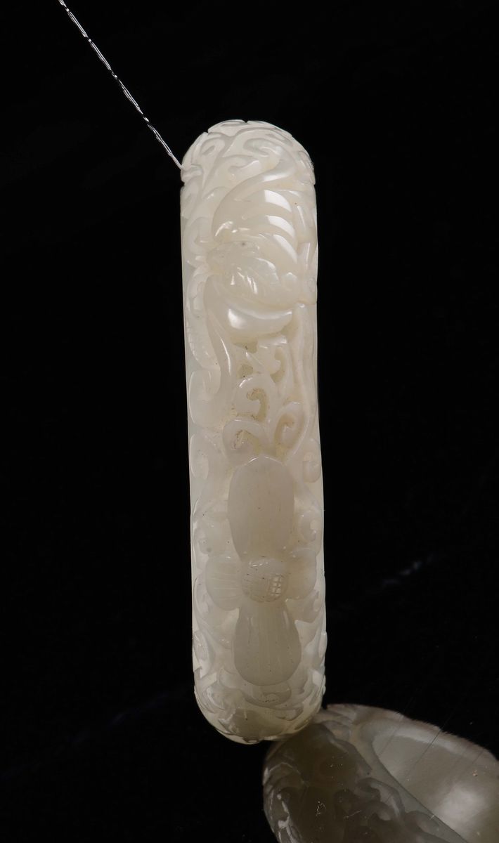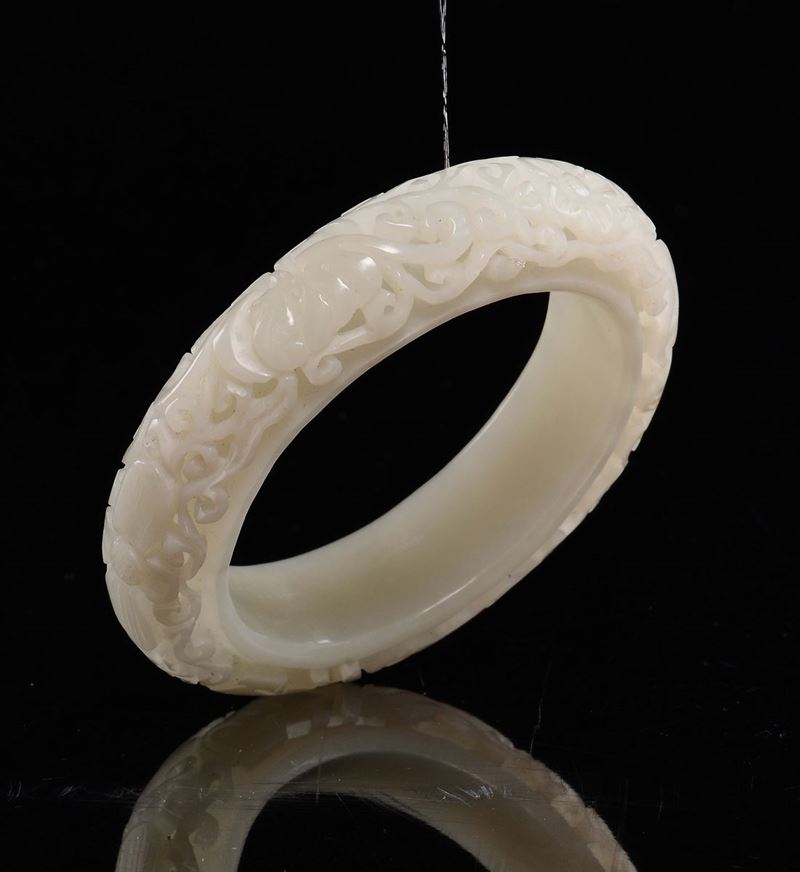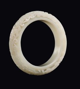 Bracciale in giada bianca con decoro floreale e gru in rilievo, Cina, Dinastia Qing, fine XIX secolo