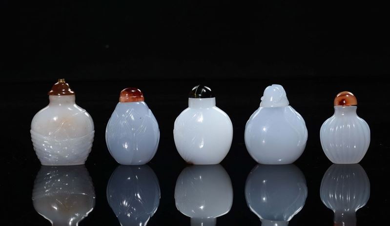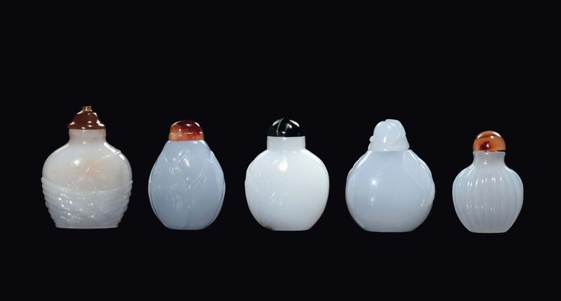 Cinque snuff bottles in agata celeste, Cina, Dinastia Qing, XIX secolo