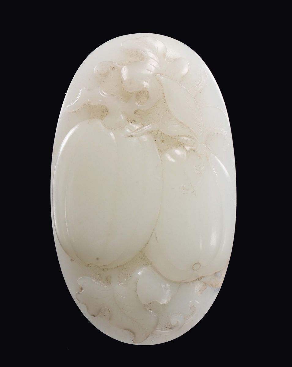 Ciondolo in giada bianca con disegno di zucche in rilievo, Cina, Dinastia Qing, XIX secolo
