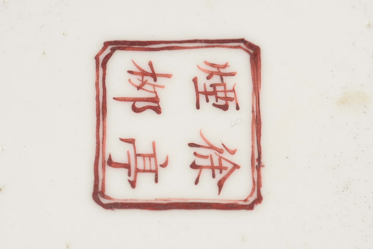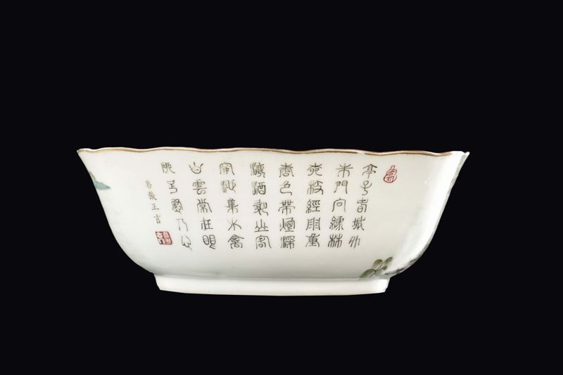 Coppa in porcellana policroma con raffigurazione di città e iscrizioni, Cina, marca e del periodo Guangxu (1875-1908)