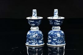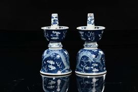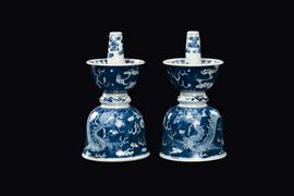 Coppia di candelieri in porcellana bianca e blu con raffigurazioni di draghi tra le nuvole, Cina, Dinastia Qing, XIX secolo