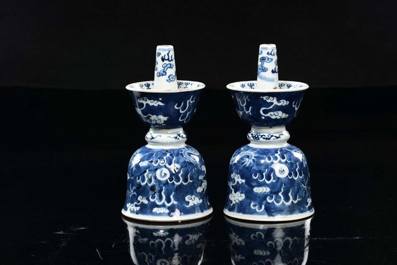 Coppia di candelieri in porcellana bianca e blu con raffigurazioni di draghi tra le nuvole, Cina, Dinastia Qing, XIX seco [..]