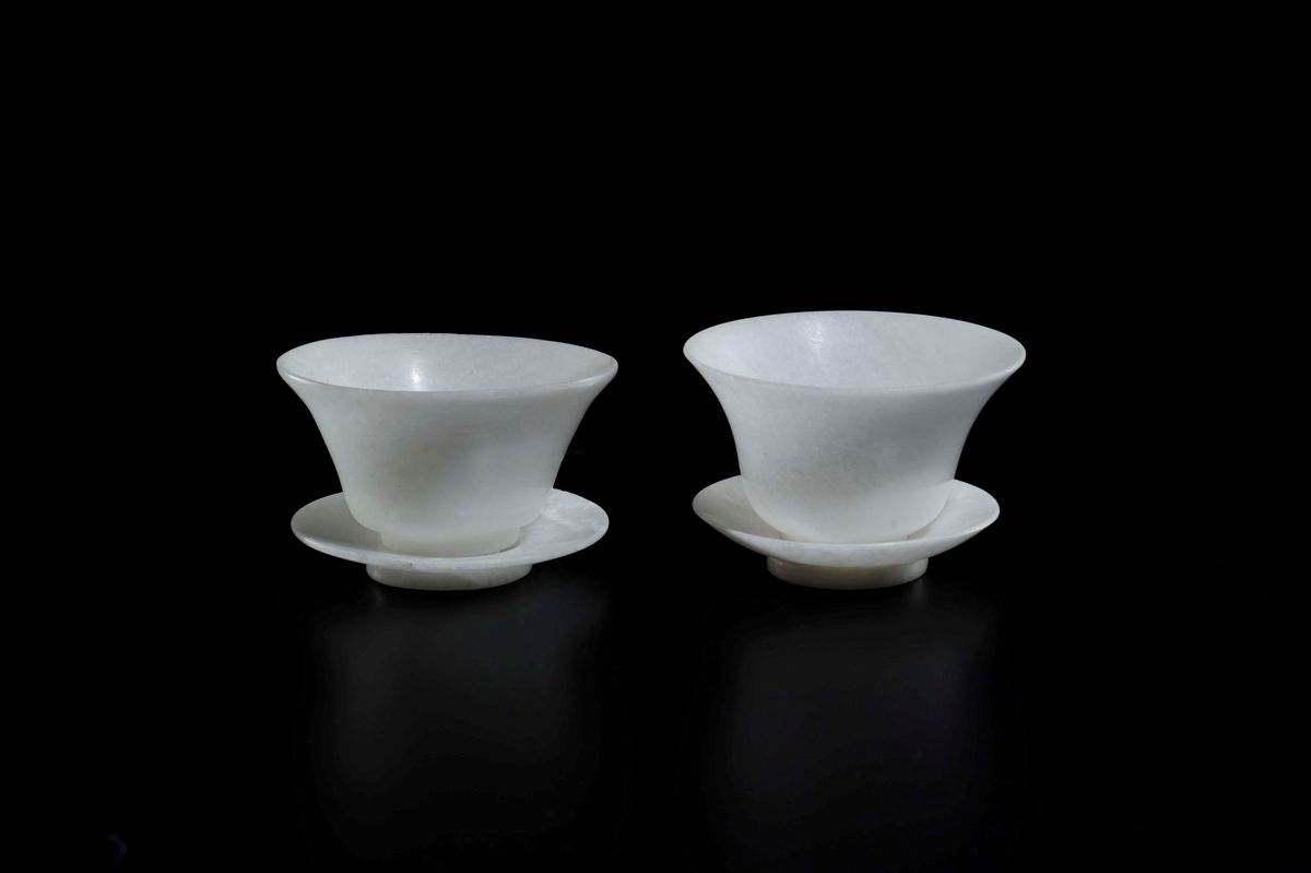 Coppia di coppette con piattini, una con coperchio, in giada bianca, Cina, Dinastia Qing, XIX secolo