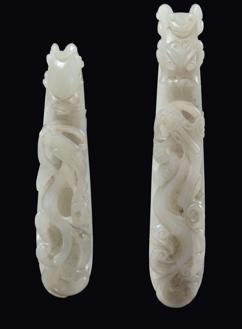 Coppia di fibbie in giada bianca scolpite a guisa di draghetto, Cina, Dinastia Qing, epoca Qianlong (1736-1795)