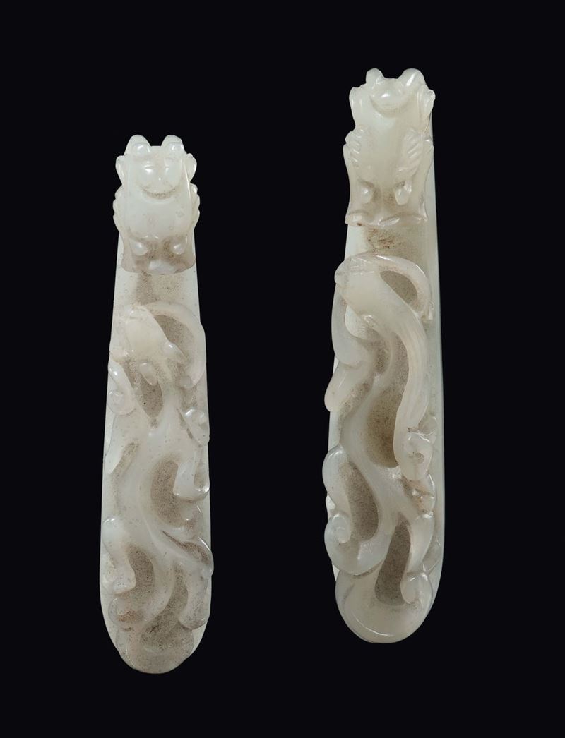 Coppia di fibbie in giada bianca scolpite a guisa di draghetto, Cina, Dinastia Qing, epoca Qianlong (1736-1795)
