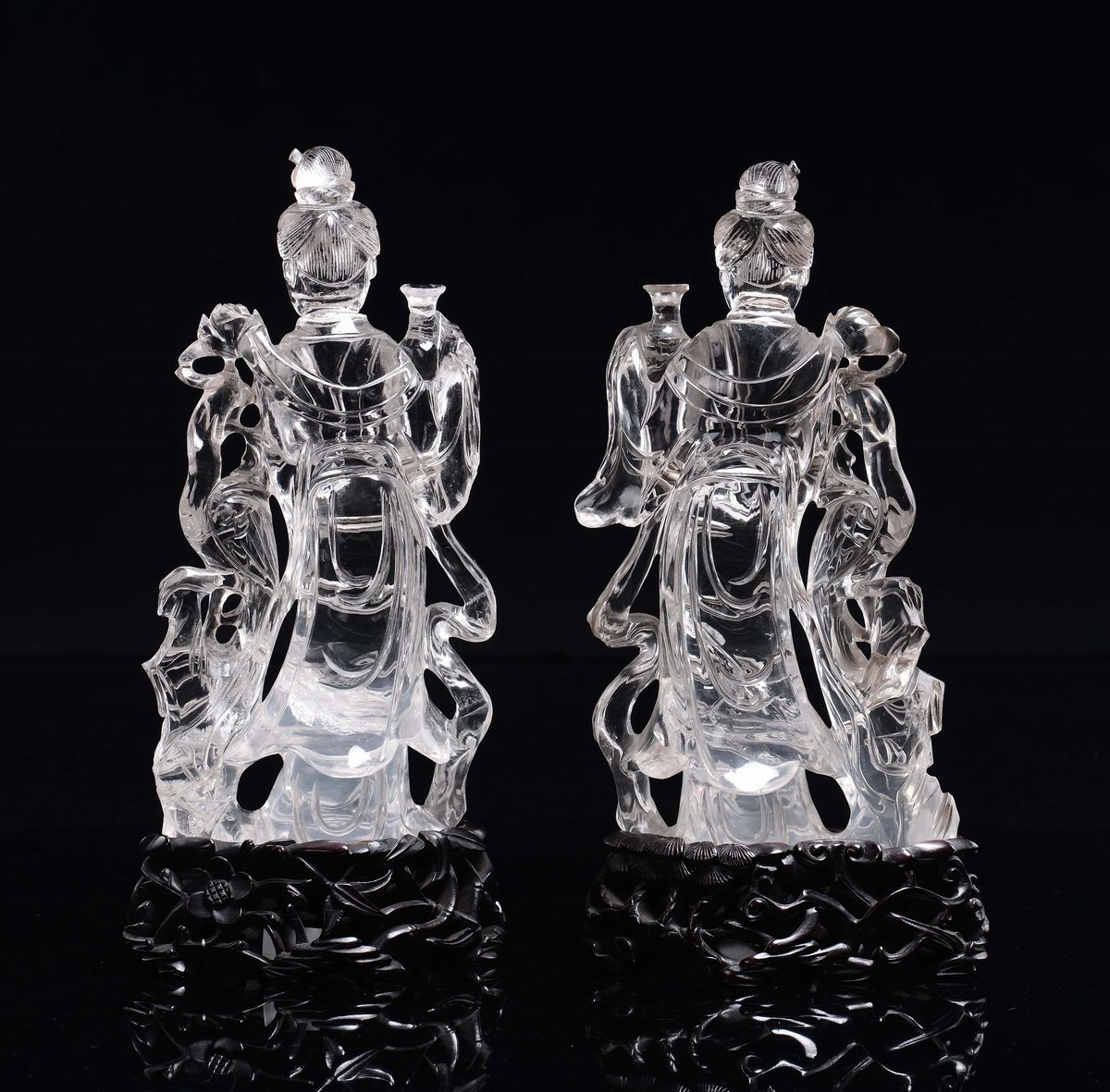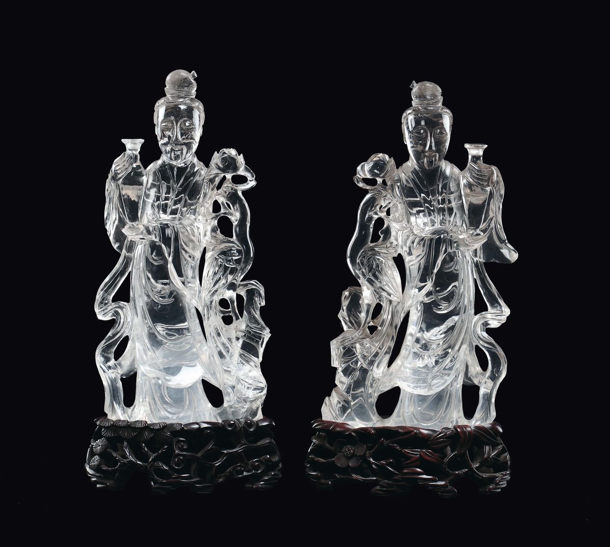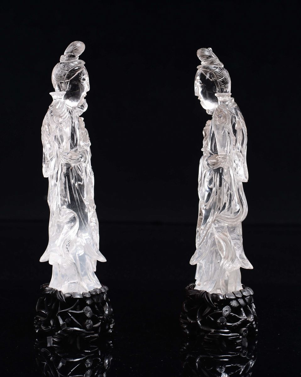 Coppia di Guanyin in cristallo di rocca con vaso in una mano e una rosa nell'altra, Cina, Dinastia Qing, XIX secolo