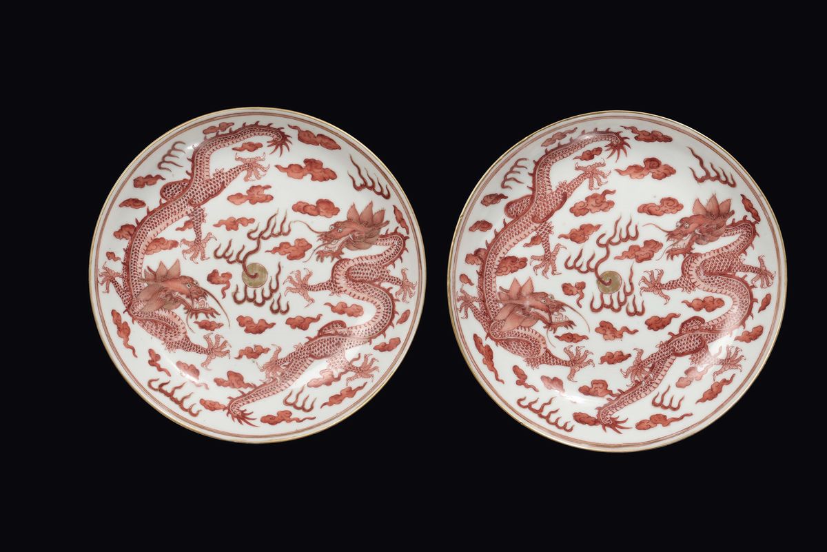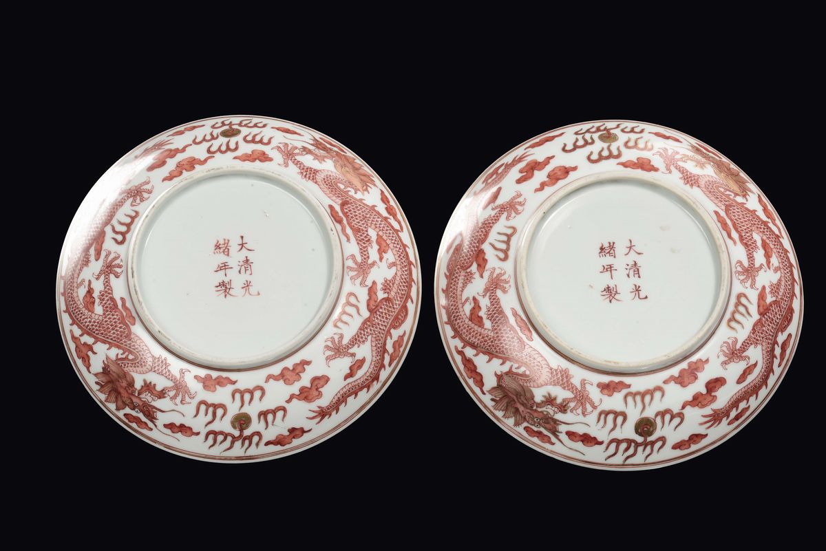 Coppia di piatti in porcellana policroma con due draghi arancioni con lumeggiature in oro, Cina, marca e del periodo Guangxu (1875-1908)