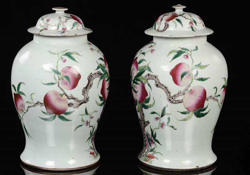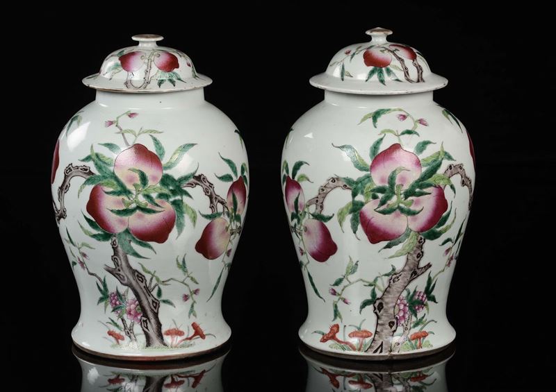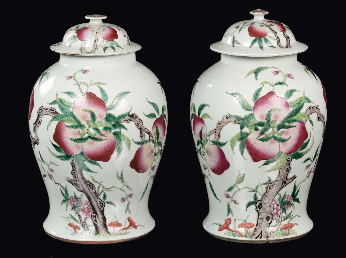 Coppia di potiches con coperchio in porcellana policroma con raffigurazioni di pesche, Cina, Dinastia Qing, XIX secolo