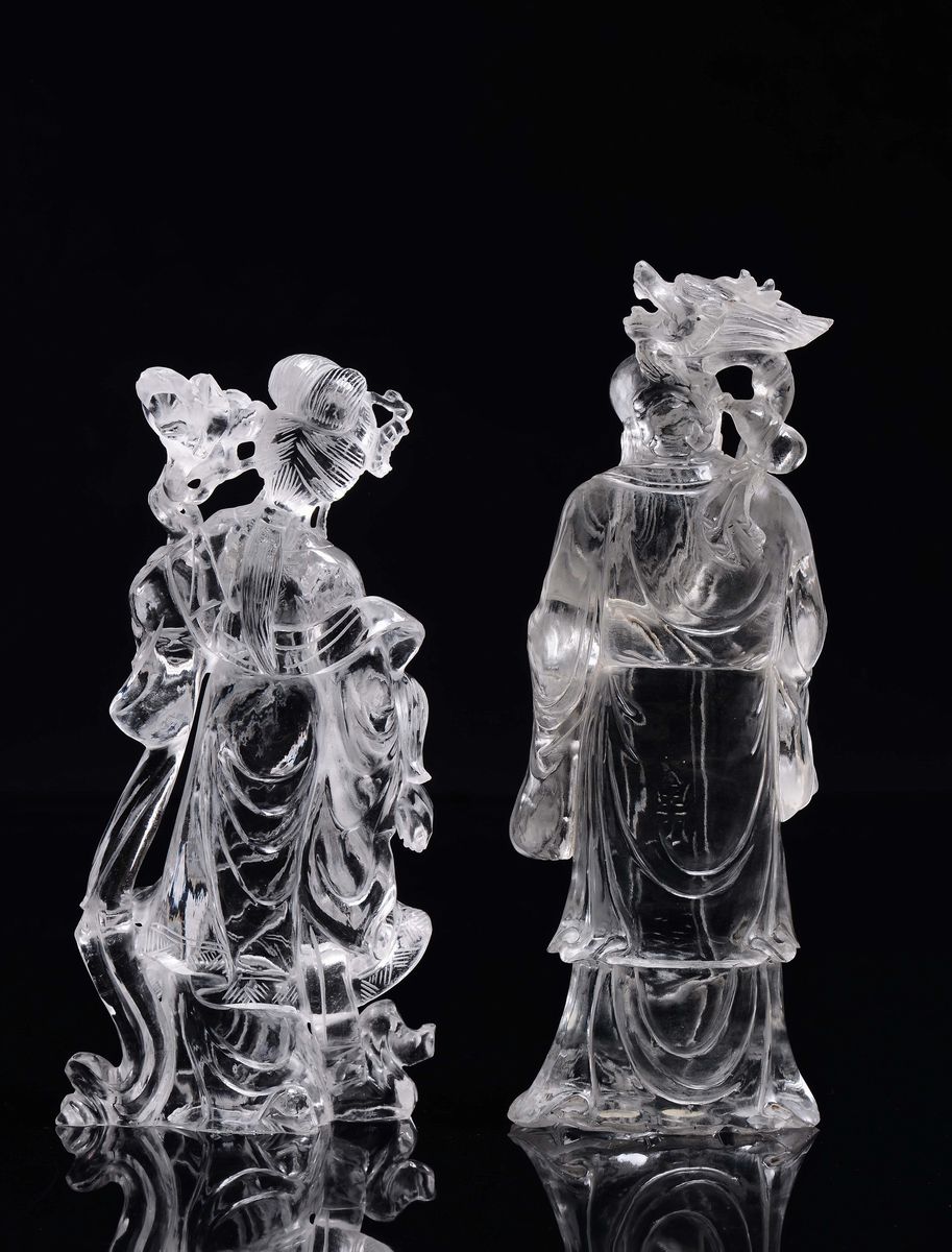 Coppia di sculture in cristallo di rocca raffiguranti Shoulao con pesce e una Guanyin con fiori, Cina, XX secolo