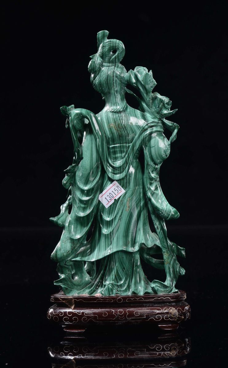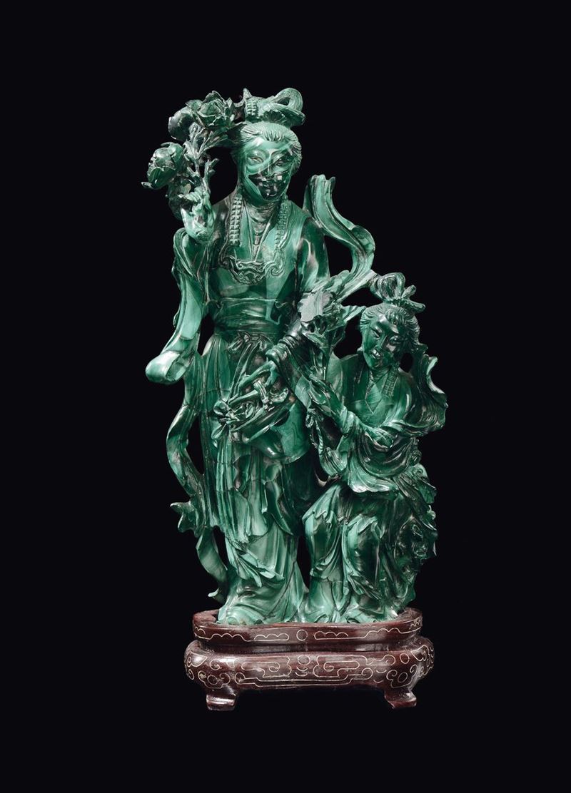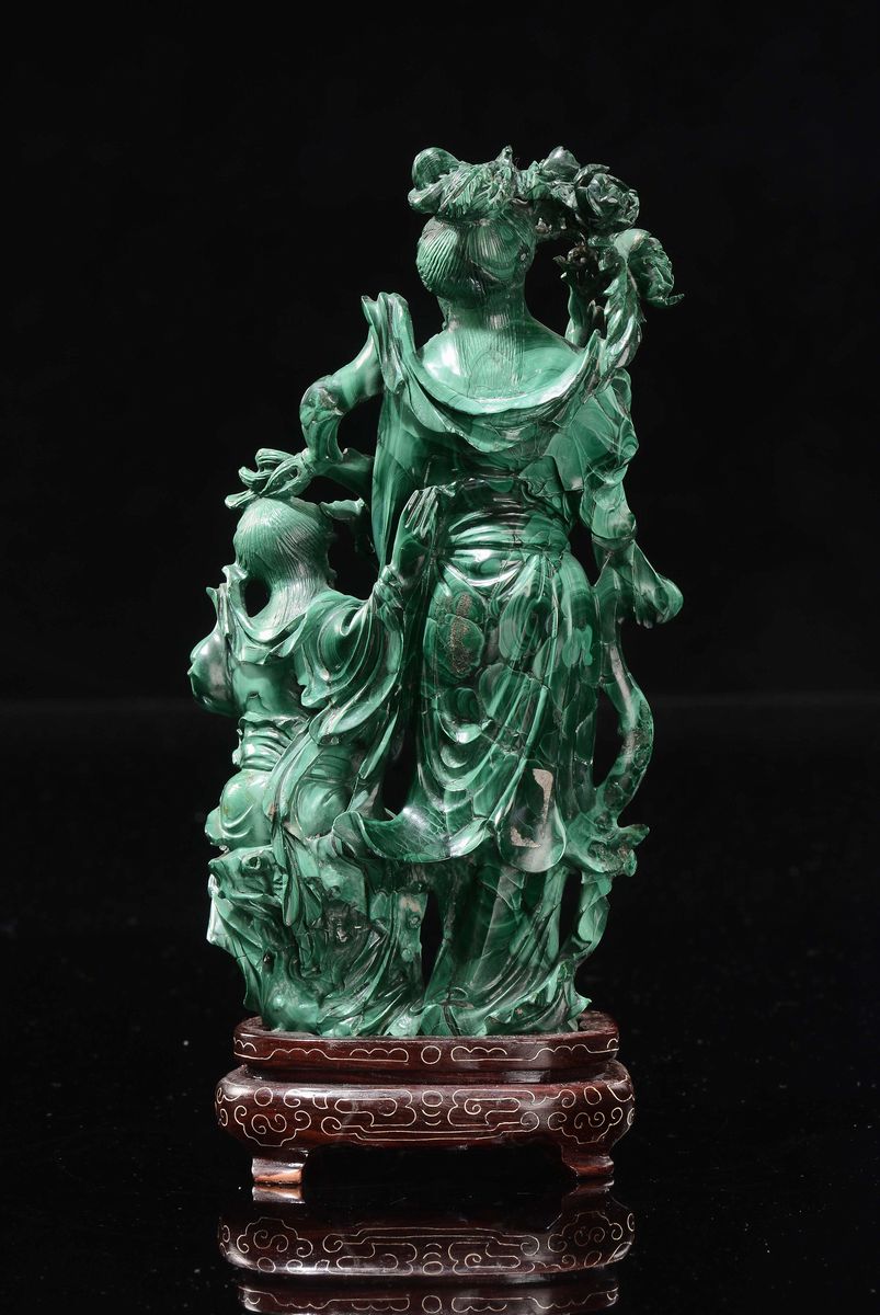 Coppia di sculture raffiguranti Guanyin con rose tra le mani in malachite, Cina, Dinastia Qing, XIX secolo