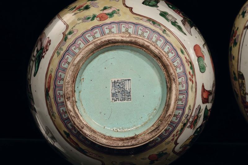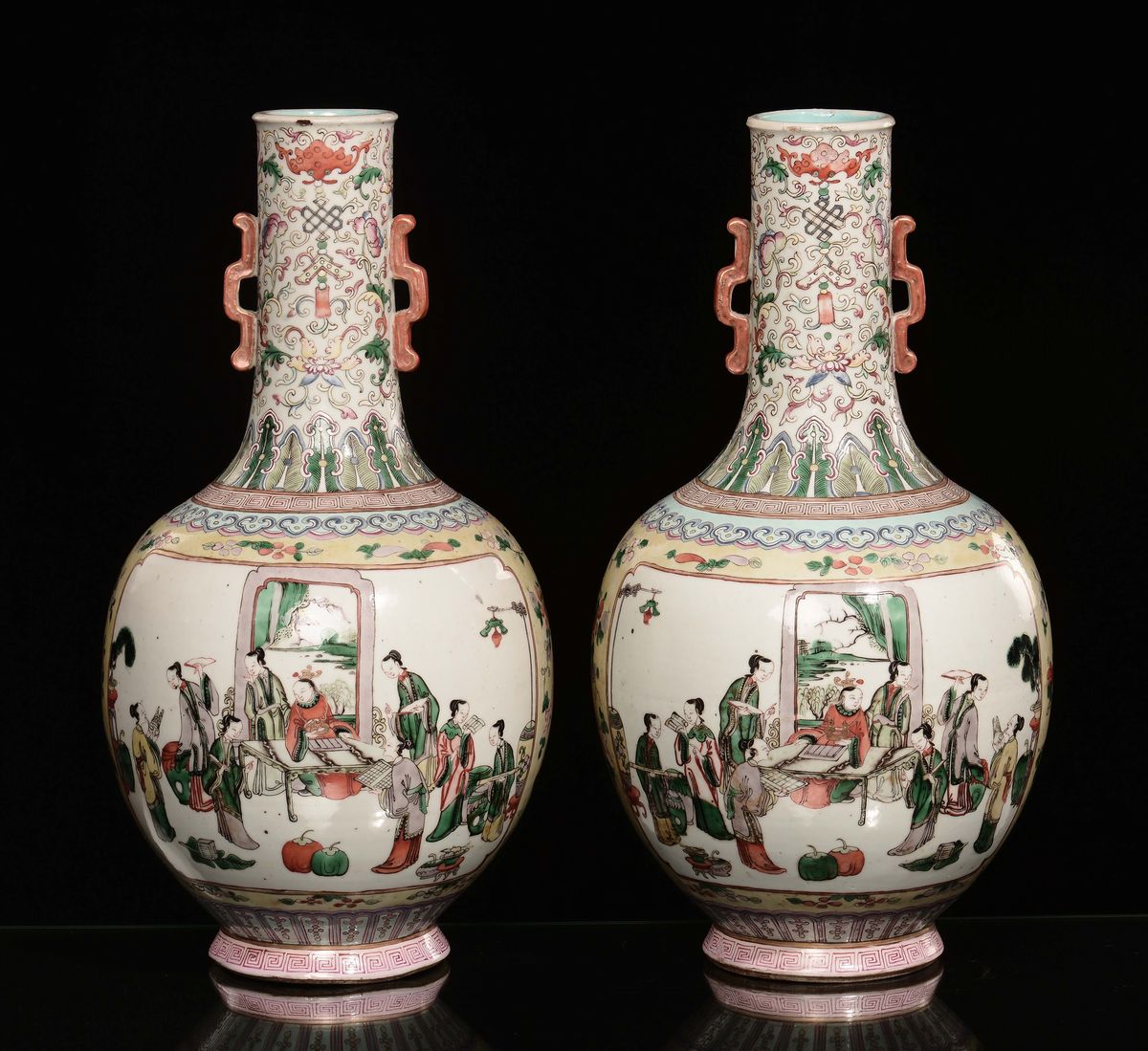 Coppia di vasi ad ampolla in porcellana Famiglia Verde con scene di vita di corte, Cina, Dinastia Qing, XIX secolo