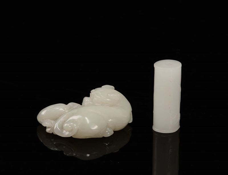 Due giade bianche, una raffigurante cani in posizione dormiente e una cilindrica con inciso fanciullo intento a pescare, [..]